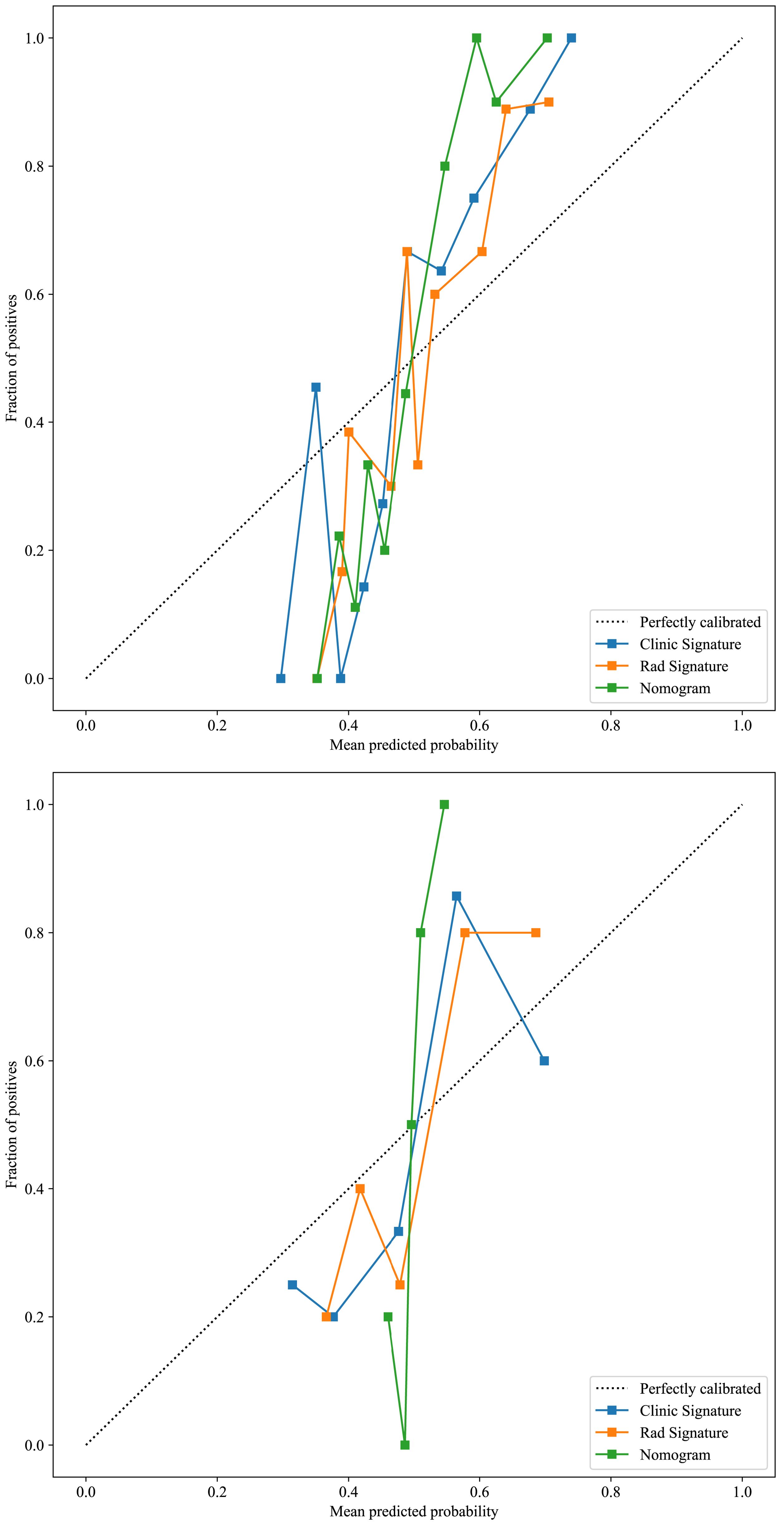 Figure 8. The calibration curves for the training and test cohorts, along with the Hosmer-Lemeshow test results. The calilbration curves of this model were obtained by resampling 1000 times. The LGBM-nomogram calibration curves indicate a good agreement between predicted and observed outcomes for LRDM in both cohorts. These results demonstrate that the nomogram performs exceptionally well in both the training and test cohorts.