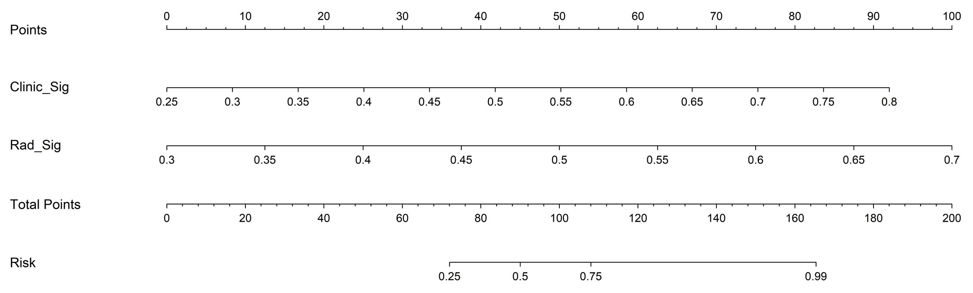 A review study has found that elevated pretreatment levels of squamous cell carcinoma antigen (SCC Ag) are associated with poor survival rates in patients with cervical cancer who undergo definitive concurrent chemoradiotherapy (24). Hou et al. (25) studied that SCC-Ag, CEA, CA125, PLT, FIB and CRP were identified as important predictors of lymph node metastasis in IA2-IIA1 cervical cancer patients. According to clinical experience and relevant literature (26), we know that age is an important factor in the clinical prognosis of cervical cancer (CC) patients. This study failed to identify a significant role of age in influencing local recurrence or distant metastasis in LACC patients following CRT treatment. A possible explanation may lie in the fact that this was a single-center retrospective study, which is susceptible to selection bias. Middle-aged and older patients who sought medical care might have constituted a self-selected group with stronger health-seeking intentions and comparatively better physical condition. According to research (27) by Brodeur et al., the FIGO 2018 classification and MRI tumor diameter were predictors of recurrence in CC. It was found that the p-values for FIGO stage and tumor diameter were greater than 0.05 in this study. We speculate that the possible reasons may include the relatively small sample size, particularly the insufficient number of advanced-stage (Stage III/IV) cases and patients with larger tumors, resulting in inadequate statistical power to detect prognostic differences among different stages and tumor size groups. Additionally, the short follow-up period might have been insufficient to observe the occurrence of adverse outcomes, leading to current data that cannot fully reflect long-term prognostic value. So we added age, tumor diameter, Figo stage, CA125, and SCCa to construct our clinical model. A study found that pre-treatment CEA levels greater than 10 ng/ml can predict a poor prognosis for advanced cervical squamous cell carcinoma (28). In our research, we also found that CEA exhibited significant statistical significance in distinguishing between positive and negative groups through multivariate logistic regression analysis. In both the training and validation groups, 10 ng/ml can indeed be used as an intercept to distinguish between positive and negative set.