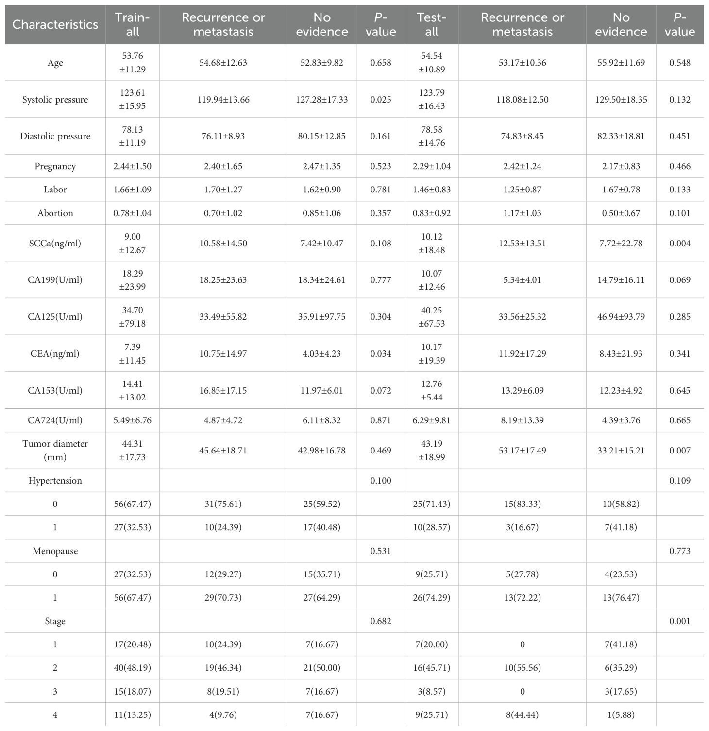 A total of 118 patients were enrolled in this study, with 59 in the metastasis or recurrence group and 59 in the group with no evidence of local recurrence or metastasis. The clinical features of the training and test groups, including age, hypertension, systolic and diastolic blood pressure, pregnancy history, labor, abortion timing, SCC antigen levels, CA199, CA125, CEA, CA153, CA724, tumor diameter, FIGO stage, and menopausal status, are detailed in Table 1. Most results lacked statistical significance, suggesting that the groupings were randomized and reasonable. In terms of radiomics parameters, both radiologists achieved good interobserver agreement, with interclass correlation coefficients (ICCs) ranging from 0.74 to 0.98.