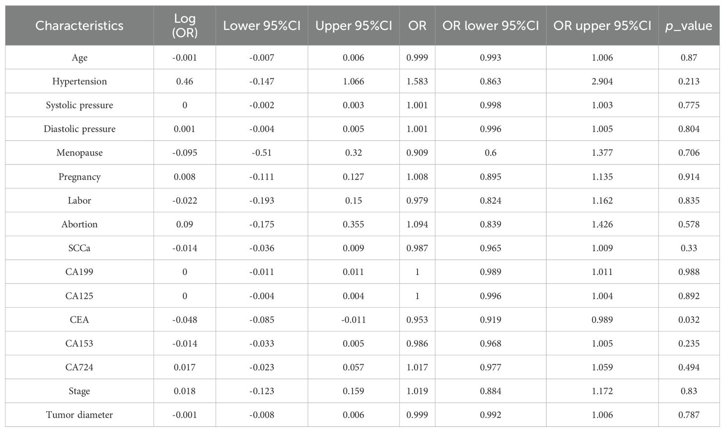 The construction of a clinical signature is nearly identical to that of a radiomic signature. Initially, features for constructing the clinical signature, CEA, were chosen based on baseline statistics with a p-value of less than 0.05. We also added age, tumor diameter, Figo stage, CA125, and SCCa to the clinical model based on relevant literature and clinical experience. The same machine learning model was used in the construction of the clinical signature.