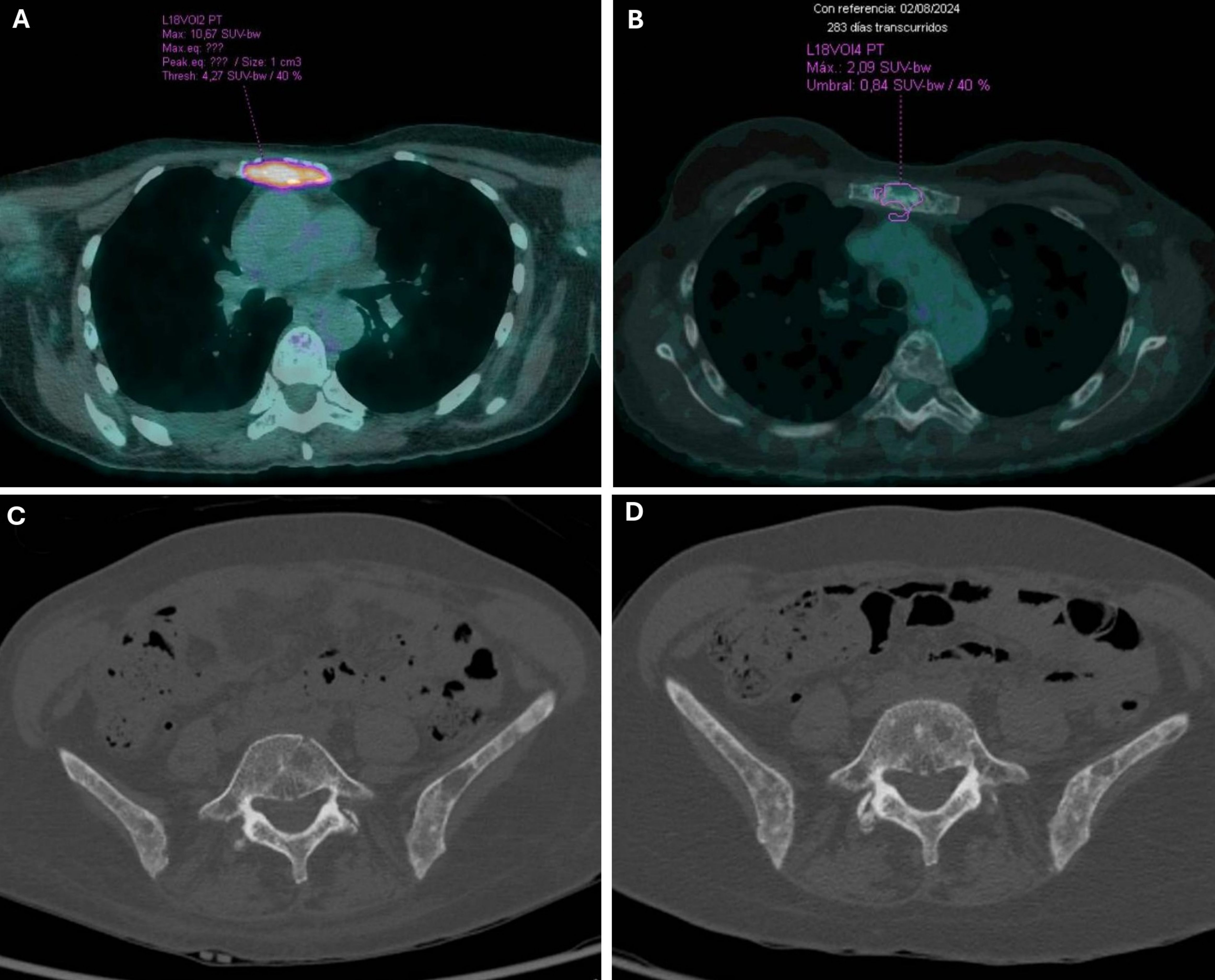 Figure 4. Comparative PET–CT images at diagnosis and after treatment. (A) PET–CT 08/02/2024: a lytic lesion was observed in the sternum with high metabolic activity [reaching a Maximum Standardized Uptake Value (SUVmax) of up to 10.67]. (B) PET–CT 05/13/2025: changes were observed in the sternum with low metabolic uptake (SUVmax 2.76, previously 20.9). (C) PET–CT 08/02/2024: at the pelvic level, there was disruption of the bone architecture with a permeative bone pattern predominantly affecting the sacrum and iliac bones, where hypermetabolic foci associated with sclerotic-lytic lesions were observed (sacrum, SUVmax up to 5.47; iliac wings, SUVmax up to 9.47; ischiopubic rami, SUVmax 5.65). (D) PET–CT 05/13/2025: at the bone level, multiple predominantly lytic changes persist in the axial skeleton, without significant metabolic uptake and with no changes compared to previous studies.