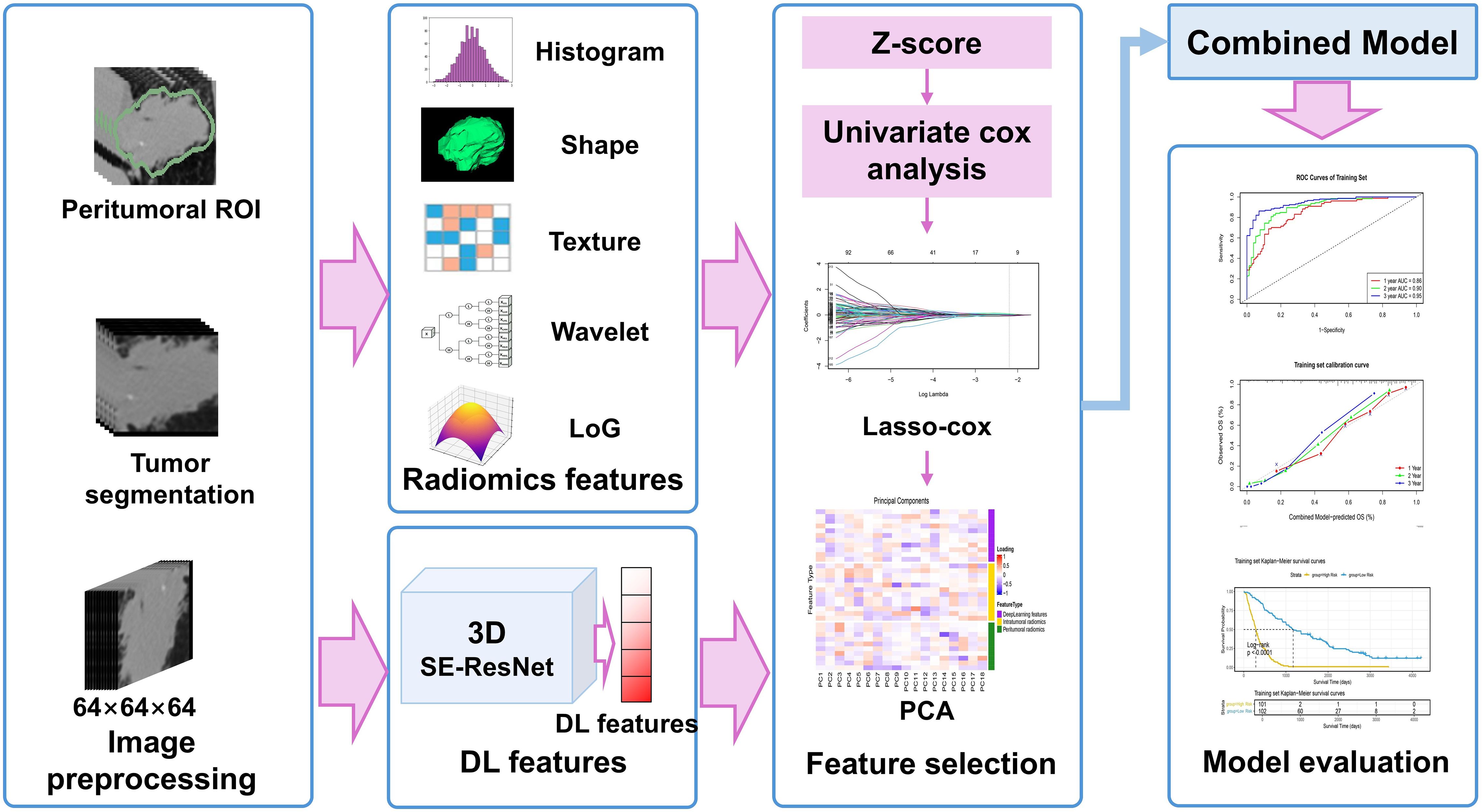 The integration of artificial intelligence (AI) with radiomics offers a novel direction for prognostic modeling. Compared with conventional 2D convolutional neural networks (CNNs), 3D CNNs can more comprehensively capture three-dimensional spatial heterogeneity and have demonstrated superiority in tasks such as pulmonary nodule classification (21–23). However, limitations exist, including overfitting risks due to limited medical imaging datasets and a shortage of networks optimized for survival analysis. We propose a novel network architecture named 3D-SE-ResNet, which embeds a squeeze-and-excitation (SE) module into the 3D ResNet framework to achieve adaptive feature channel calibration. Furthermore, this study establishes a novel paradigm for personalized prognosis by synergistically integrating intratumoral/peritumoral radiomics features with 3D deep learning (DL) features through a principal component analysis (PCA)-driven fusion strategy.