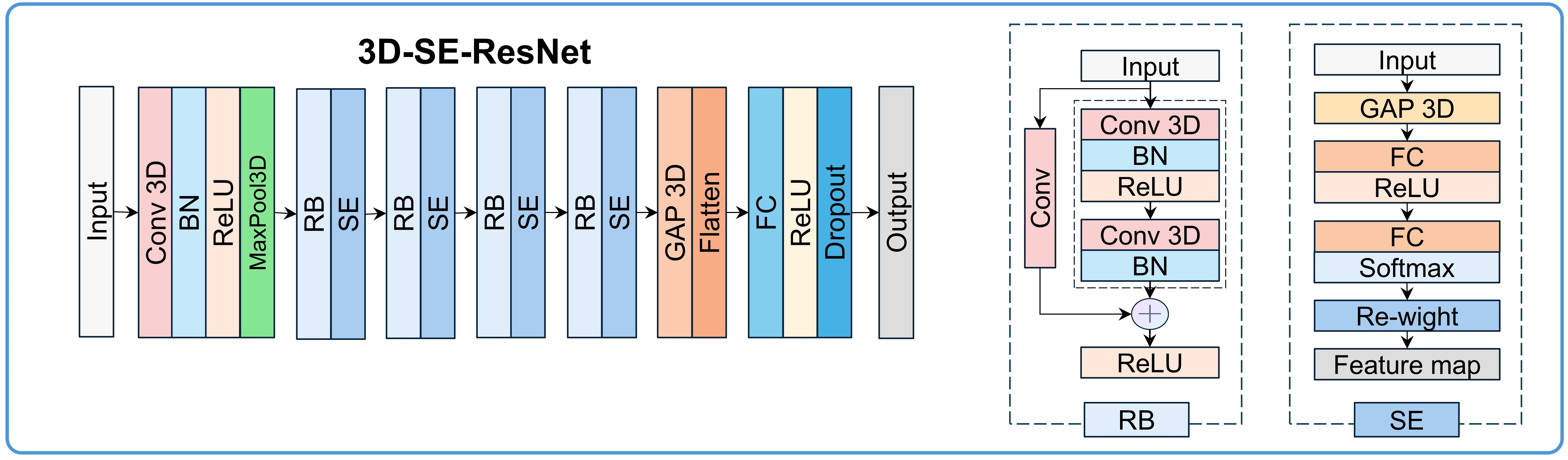 Figure 2. 3D-SE-ResNet framework diagram: BN, batch normalization; Conv, convolution layer; FC, fully connected layer; GAP, global average pooling layer; RB, residual block.