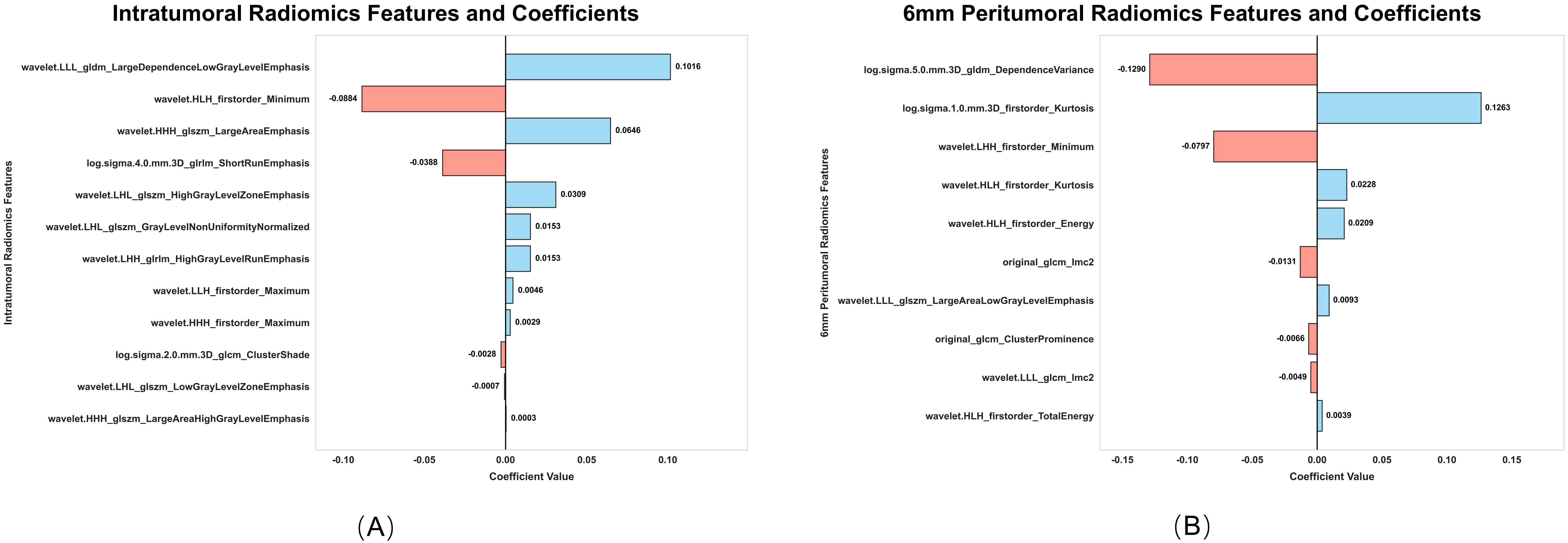From the intratumoral and peritumoral regions (3 mm, 6 mm, and 9 mm expansions), 1316 radiomics features were extracted. Univariate cox regression identified 214 significant intratumoral radiomics features and 83, 88, and 125 peritumoral radiomics features, respectively. Subsequent Lasso-Cox analysis further refined these features to 12 intratumoral and 9, 10, and 10 peritumoral key radiomics features. To explore the synergistic effects of the intratumoral and peritumoral regions, combined radiomics signatures were generated by integrating selected radiomics features from both regions. Predictive performance varied significantly across peritumoral expansion distances and their combinations (Table 3). Among the standalone peritumoral radiomics signatures, the 6-mm expansion radiomics signature achieved the highest C-index (0.63, 95% CI: 0.58–0.67), whereas the combined Rad+Rad_6 mm radiomics signature further improved the C-index (0.65, 95% CI: 0.60–0.69); thus, this radiomics signature was selected as the standardized peritumoral region. The names and corresponding coefficients of all features within the Rad + Rad_6 mm radiomics signature are presented in Figure 3.