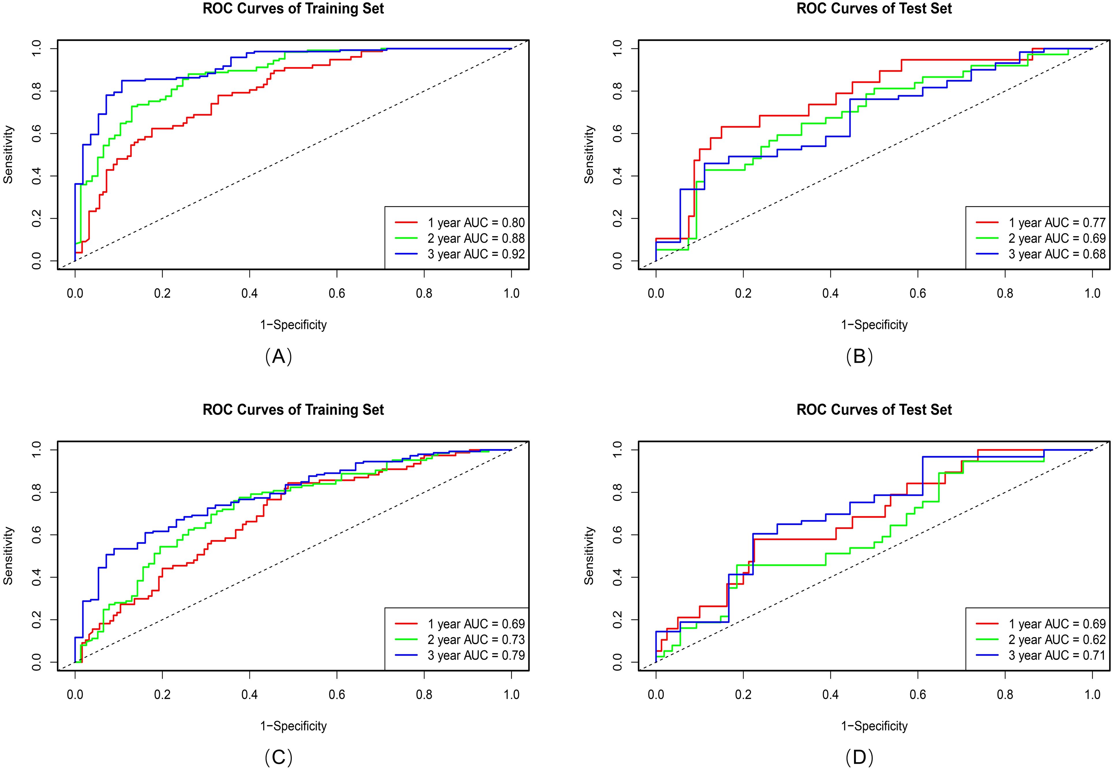 Figure 4. ROC curves of the 3D-SE-ResNet (A, B) and 3D ResNet (C, D) DL signatures on training and test sets.