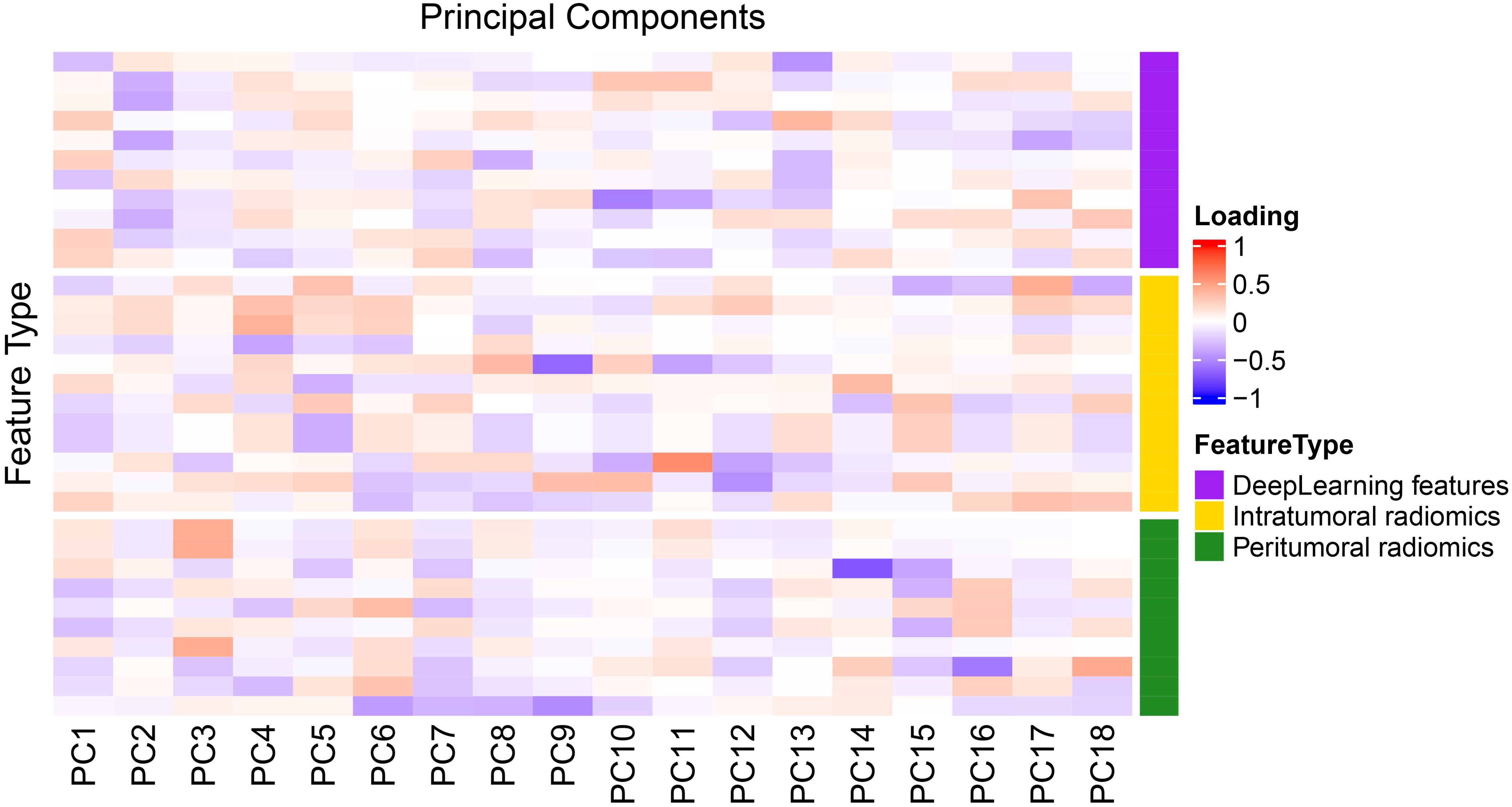 Principal component analysis (PCA) was performed on the integrated intratumoral/peritumoral radiomics and deep learning features, retaining components accounting for ≥ 95% of the cumulative variance. Factor loading heatmaps were used to visualize the contribution of each feature to the principal components. Within the training set, the dimensionality-reduced features were integrated to construct the combined predictive model.