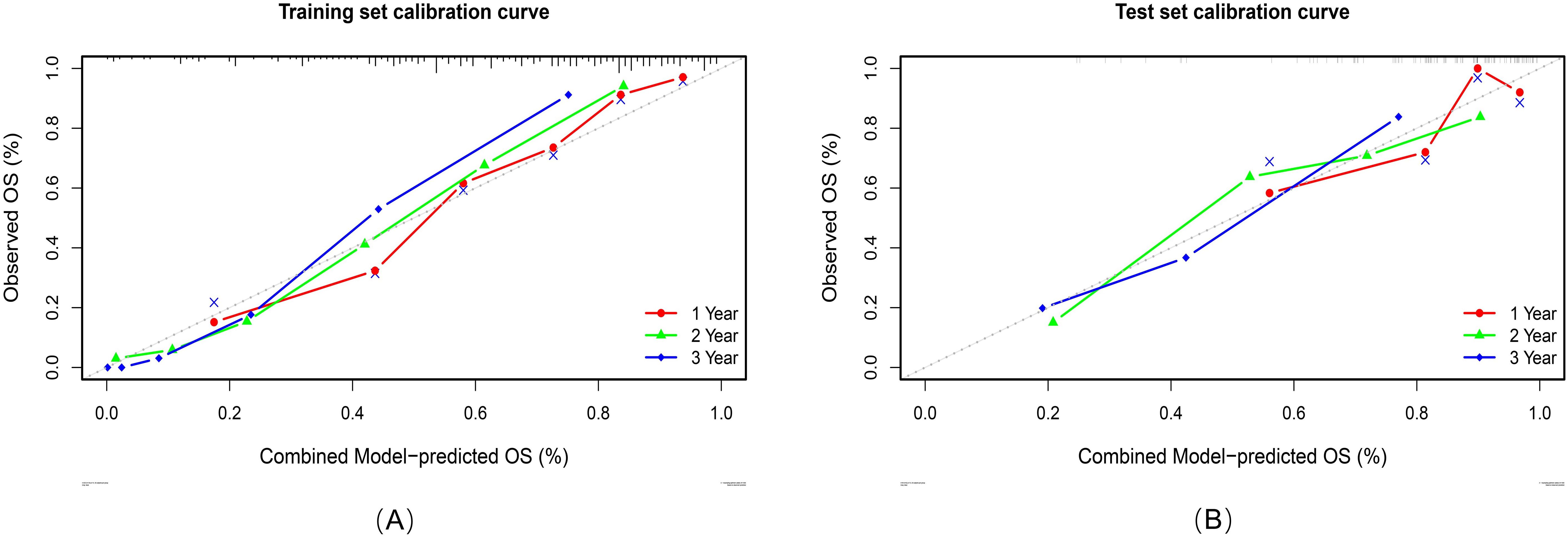 Figure 8. Kaplan-Meier survival curves of the combined model in the training set (A), and test set (B).