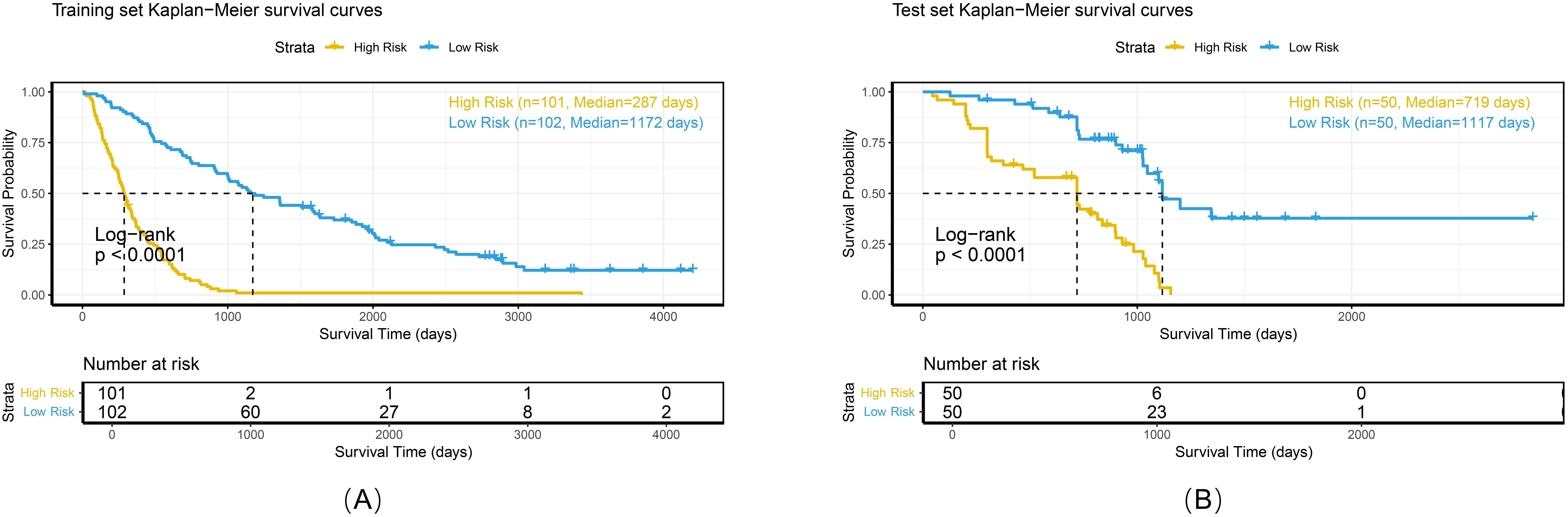 Calibration analyses revealed high concordance between the predicted and observed survival probabilities (Figure 7). Patients were stratified into high-risk and low-risk groups by applying a risk threshold (cutoff value = 1.14), which was derived from the combined model’s median risk score. The high-risk group had a significantly poorer prognosis compared to the low-risk group in both datasets: the hazard ratio (HR) for the training set was 5.39 (95% CI: 3.83–7.59), and for the test set was 4.48 (95% CI: 2.54–7.91). Kaplan–Meier analysis further confirmed significant survival differences between the two risk groups (log-rank P < 0.0001 for both datasets; Figure 8).