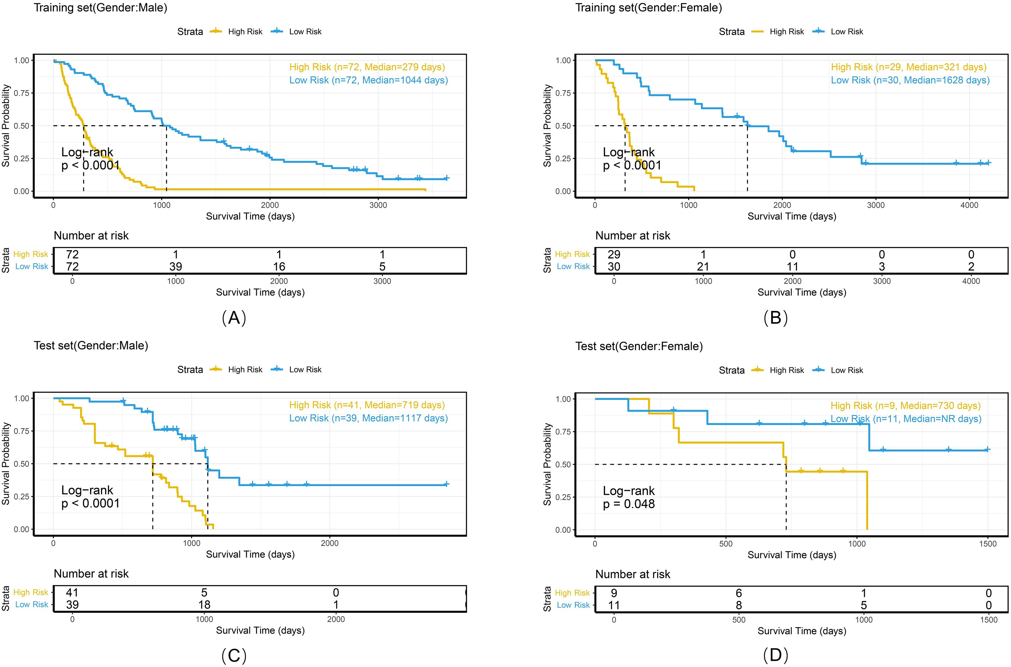 Figure 9. Kaplan-Meier survival curves of the combined model stratified by gender in the training set (A, B) and test set (C, D).