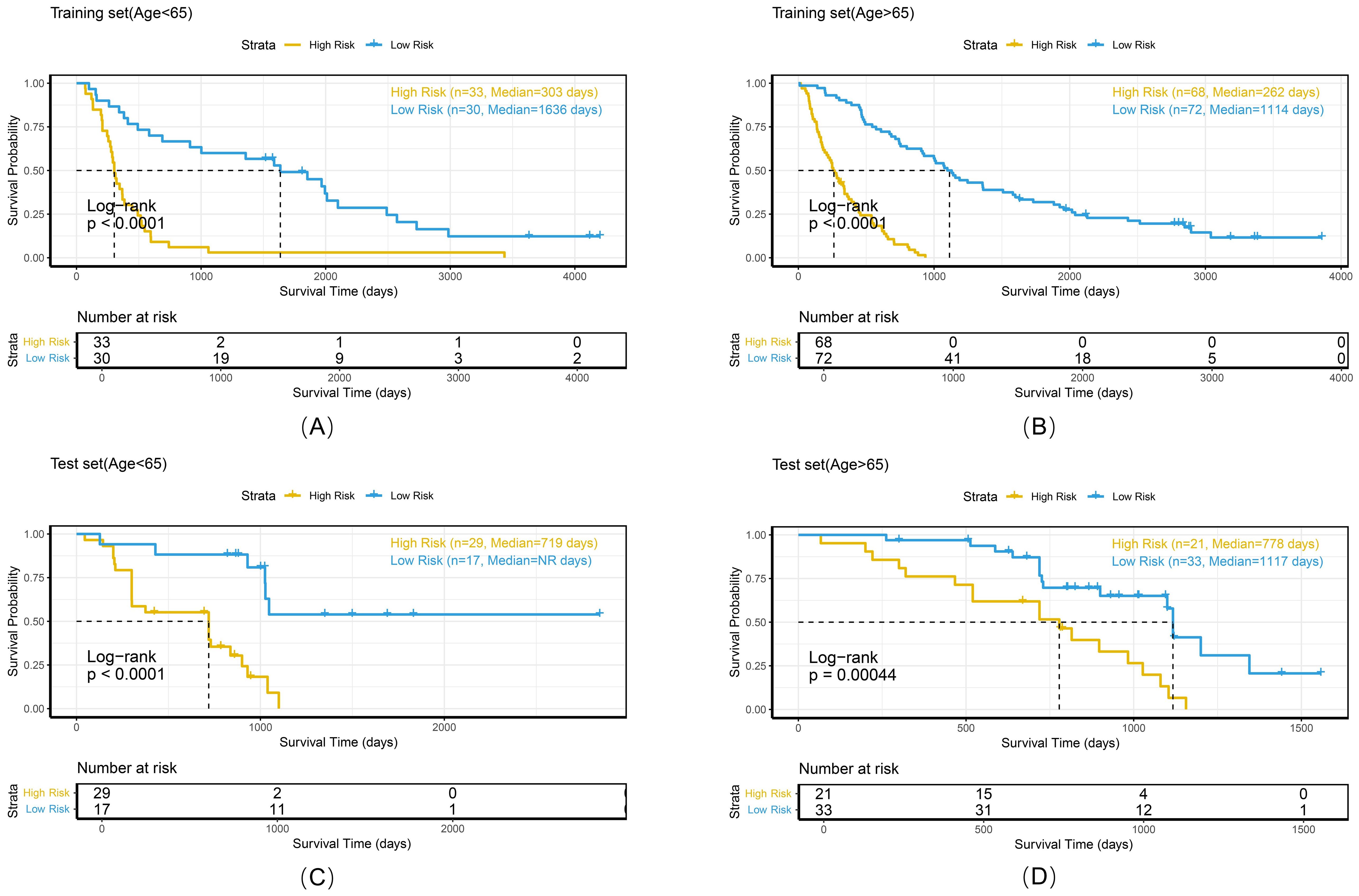 Figure 10. Kaplan-Meier survival curves of the combined model stratified by age in the training set (A, B) and test set (C, D).