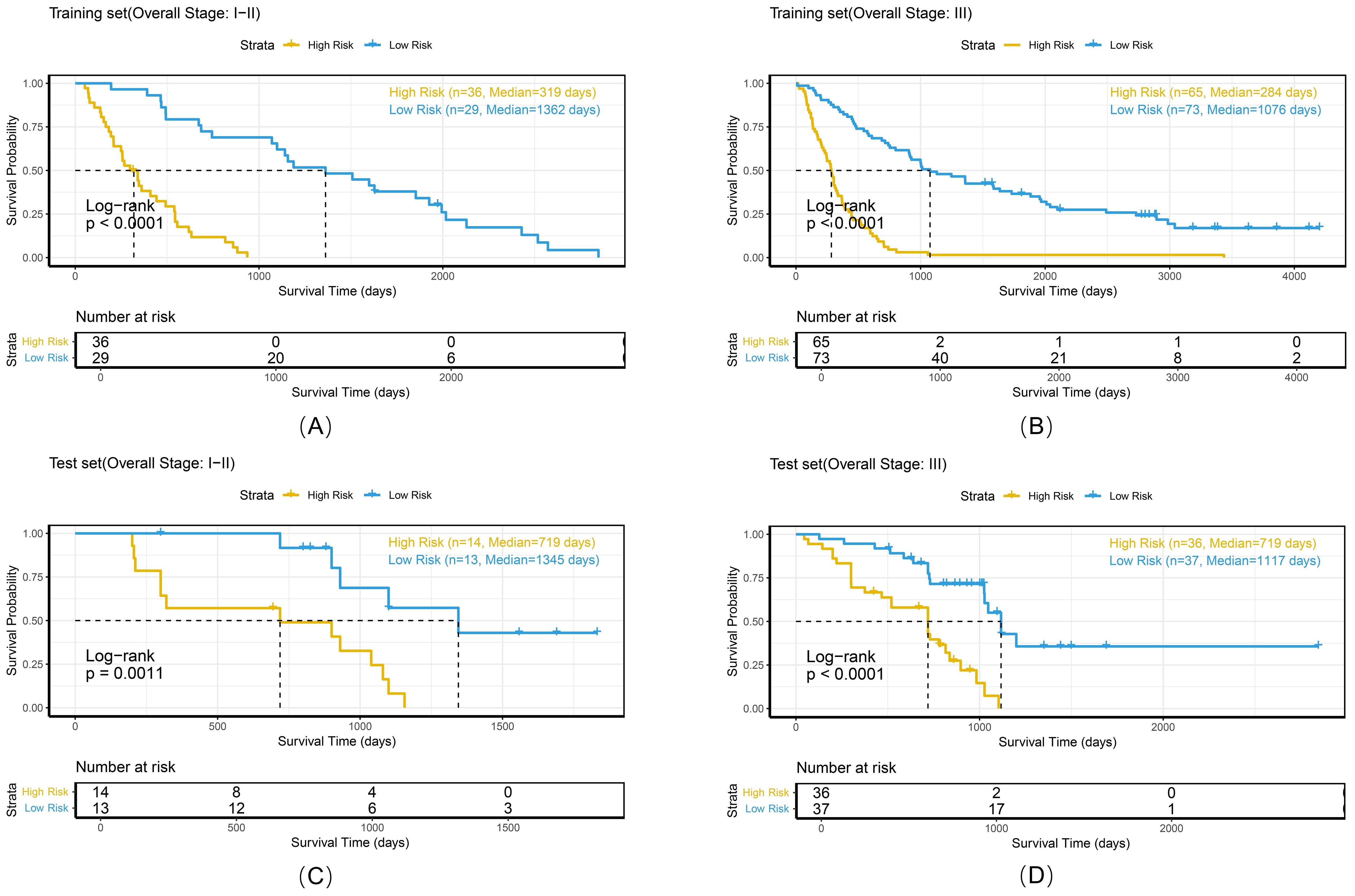 Figure 12. Kaplan-Meier survival curves of the combined model stratified by overall stage in the training set (A, B) and test set (C, D).
