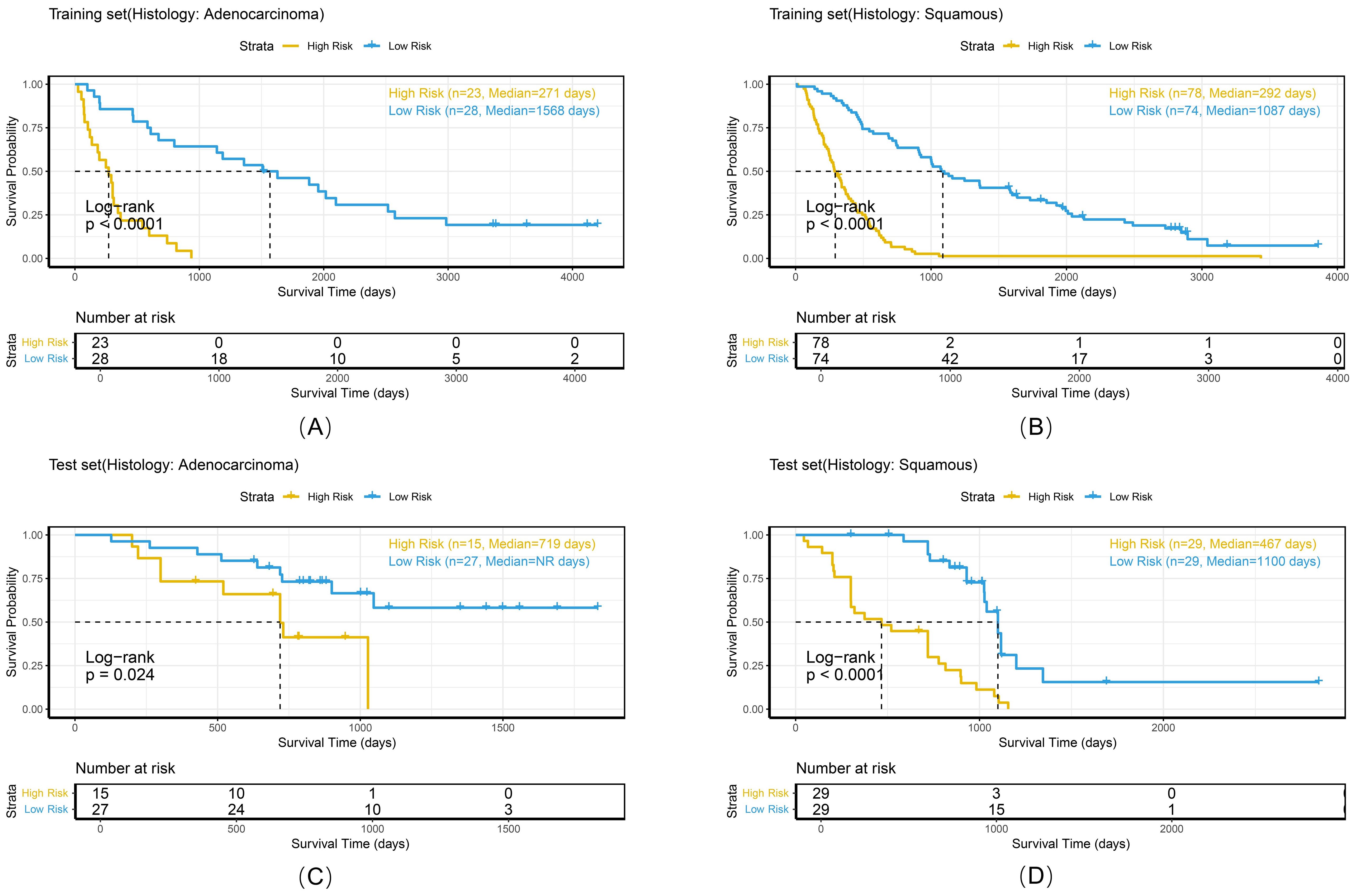Figure 11. Kaplan-Meier survival curves of the combined model stratified by histologic subtype in the training set (A, B) and test set (C, D).