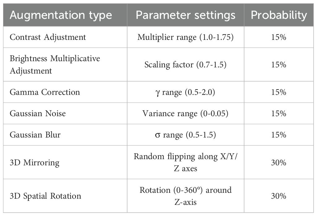 The model training encompassed three phases: preprocessing, augmentation, and optimization. Intratumoral ROIs were resized to 64×64×64 via linear interpolation and normalized via Z score transformation. To increase data diversity, seven types of 3D augmentations were implemented, including contrast adjustment, brightness scaling, gamma correction, Gaussian noise addition, blurring, 3D mirroring, and spatial rotation, with the technical specifications provided in Table 1. Network optimization employs the Cox negative partial likelihood loss function (25), which is optimized via the Adam optimizer with an initial learning rate of 1×10-4, exponentially decayed by a factor of 0.96 every 1000 steps, and a batch size of 32. Training proceeded for 100 epochs with early stopping triggered if the validation loss plateaued for 15 consecutive epochs. The feature vectors (512-dimensional) were extracted from the GAP layer post training. All the implementations utilized TensorFlow 2.7 on an NVIDIA GeForce RTX 4070 Ti GPU with CUDA 11.2 acceleration.