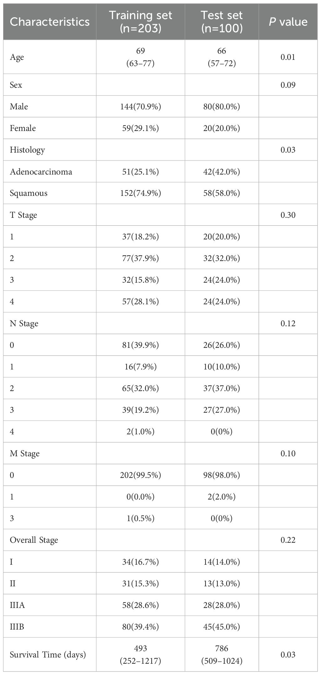 This multicenter retrospective study included 303 non-small cell lung cancer (NSCLC) patients from three centers. The training set included 203 adenocarcinoma and squamous cell carcinoma patients from the publicly available MAASTRO Clinic dataset (24), with the study dates (from the metadata file) ranging from November 2004 to January 2014. The test set included 100 histologically confirmed adenocarcinoma or squamous cell carcinoma patients enrolled between January 2016 and August 2021 (68 from the Seventh Medical Center of Chinese PLA General Hospital and 32 from Shandong Provincial Hospital Affiliated with Shandong First Medical University), all of whom met the following criteria.
