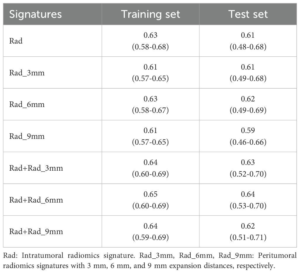 Table 3. Comparison of C-index (95%CI) for intratumoral/peritumoral radiomics signatures with different expansion distances.