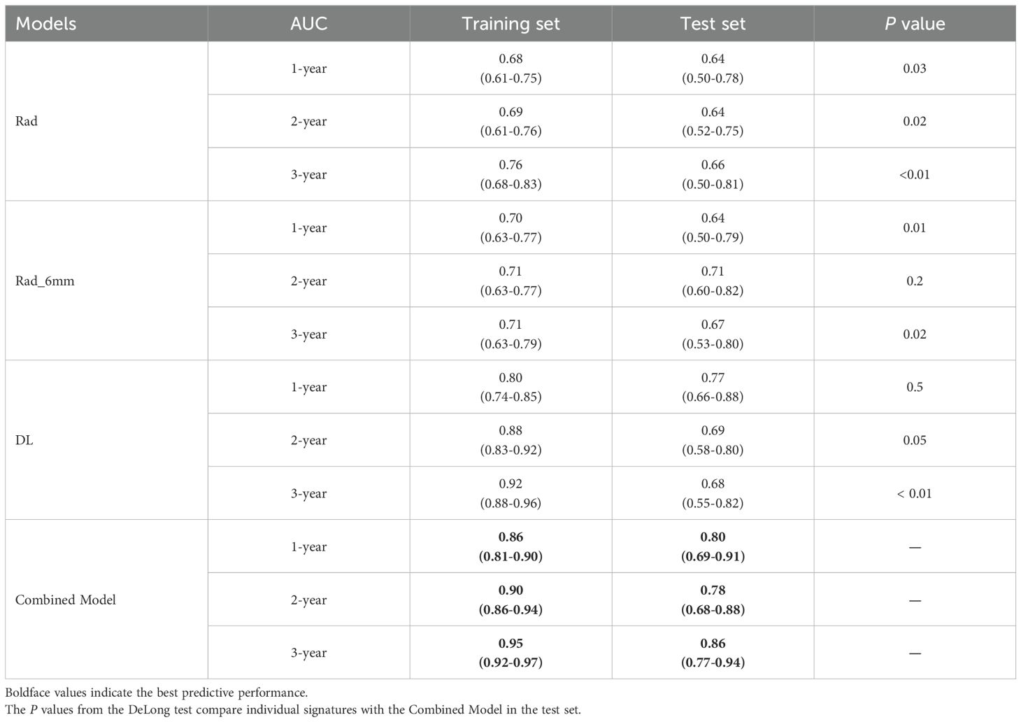 Among 512 deep learning (DL) features extracted from 3D-SE-ResNet, 11 key prognostic features were retained after univariate cox and Lasso-Cox screening. Compared with the intratumoral and 6-mm peritumoral radiomics signatures, the DL signature showed a trend of improved discriminative performance, with a C-index of 0.74 (95% CI: 0.70-0.77) in the training set and 0.66 (95% CI: 0.58–0.73) in the test set. Ablation experiments confirmed the critical role of the SE module: its integration yielded a 13.8% performance gain in the 3D-ResNet model (C-index: 0.74 vs. 0.65), indicating that the SE module effectively enhances the extraction of prognosis-related features. As shown in Figure 4, the AUC values of the 3D-SE-ResNet DL signature for predicting 1-, 2-, and 3-year overall survival were higher than those of the baseline model at all timepoints.