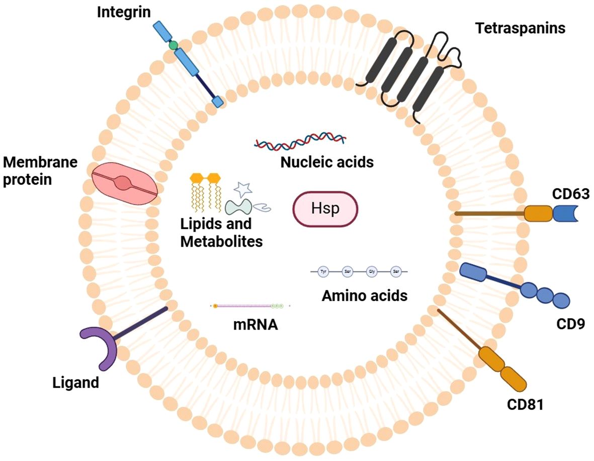 Figure 1. Representation of typical exosome structure. The figure outlines the defining characteristics of an exosome, which is a type of small extracellular vesicle with a membrane lipid bilayer. Relevant surface markers described above that characterize the vesicles known as exosomes are tetraspanins (CD9, CD63, CD81); they are positioned in the membrane. The internal cargo contains an assortment of bioactive compounds including proteins, messenger RNA (mRNA), microRNAs (miRNAs), and lipids which serve to modulate cellular communication, intercellular signaling and maturation of the target cells. This structural outline increases understanding of exosomes regarding their complex constituents and structures and their importance in biology under normal and disease conditions.