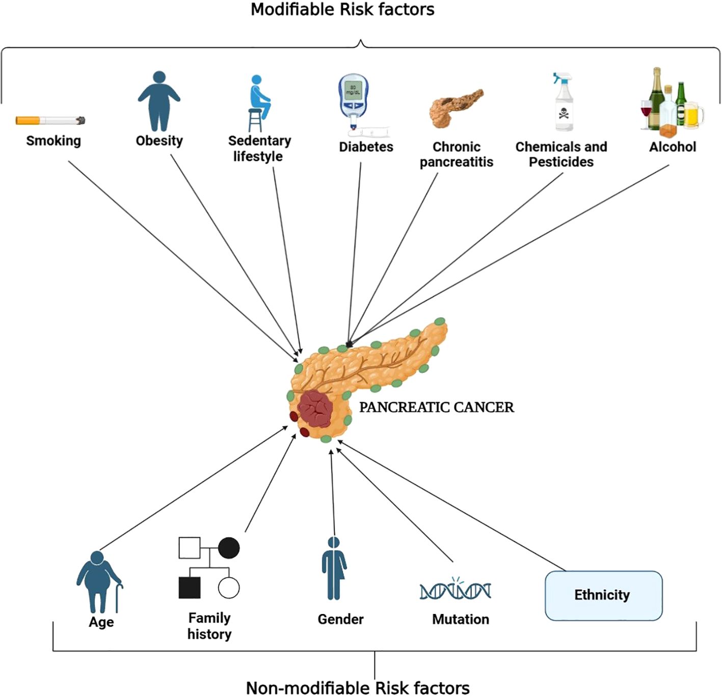 Figure 2. Overview of risk factors associated with the development of pancreatic cancer. The diagram separates the modifiable and non-modifiable risk factors associated with pancreatic cancer. Concerning modifiable risk factors, these include smoking, a diet high in fat, physical inactivity, obesity, chronic pancreatitis, diabetes mellitus, heavy alcohol consumption, and prolonged exposure to chemicals and pesticides. These risk factors are commonly associated with inflammation, insulin resistance, oxidative stress, and even stranding of oxidative DNA damage. On the other hand, age, family history, sex, inherited genetic mutations and ethnicity are classified as non-modifiable risk factors. The comprehensible classification of these categories assists in accuracy of detection and prevention measures.