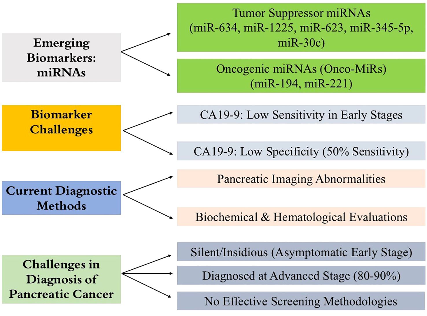 Figure 3. Diagnostic challenges in pancreatic cancer and the promise of miRNA biomarkers. The figure summarizes key barriers to early pancreatic cancer detection, including its asymptomatic progression and the limited sensitivity and specificity of current tools like CA19-9 and CEA. It also highlights the emerging potential of exosomal miRNAs as stable, noninvasive biomarkers with improved diagnostic accuracy for early-stage disease.