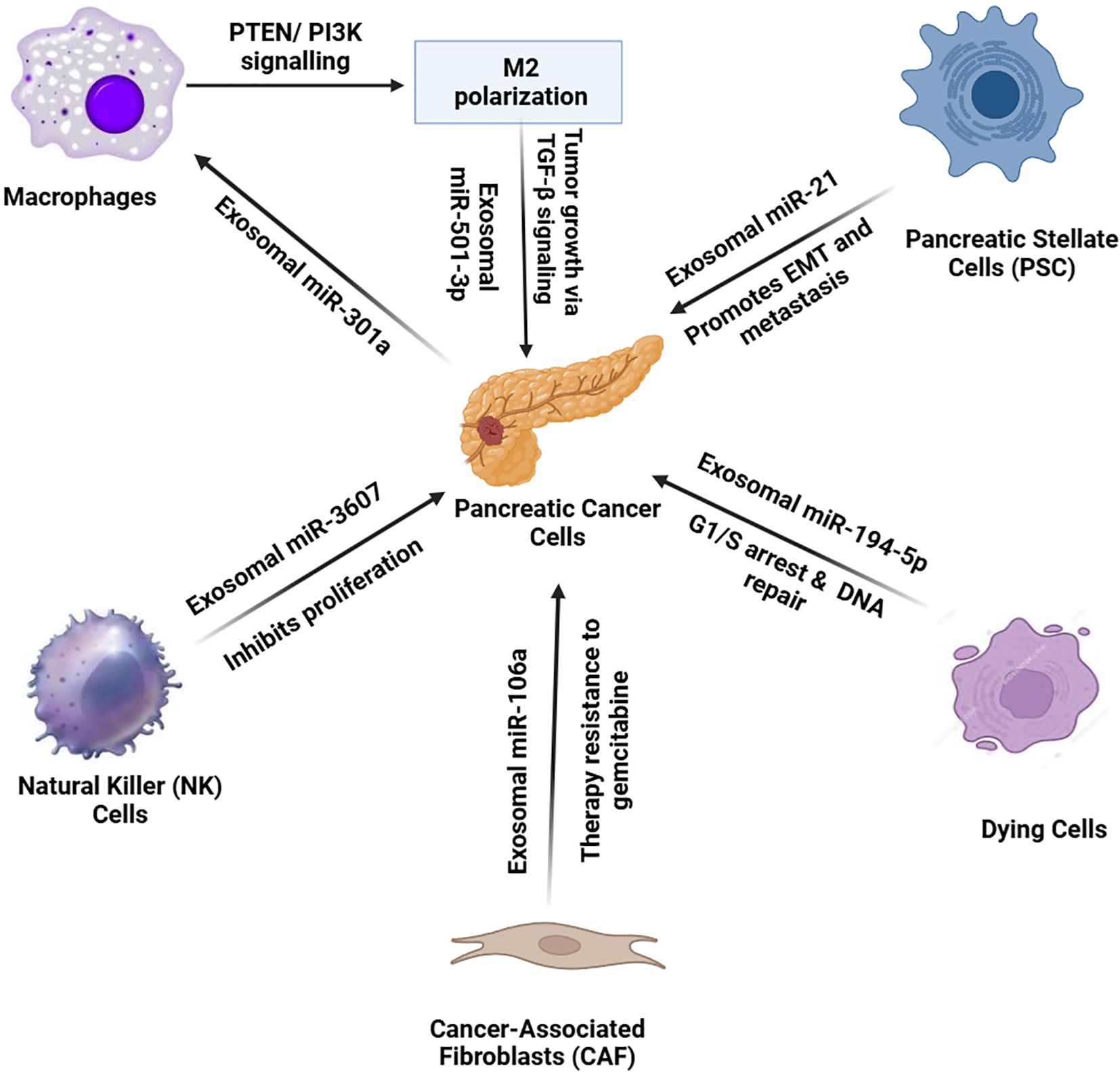 Figure 4. In the pancreatic cancer tumor microenvironment, various cell types communicate with pancreatic cancer cells through exosomal miRNAs, influencing tumor progression and therapy resistance. Cancer-associated fibroblasts (CAFs) release exosomes enriched with miR-106a, inducing resistance to gemcitabine therapy. Pancreatic stellate cells (PSCs) secrete miR-21-containing exosomes, promoting EMT and metastasis. Natural killer (NK) cells release miR-3607, inhibiting cancer cell proliferation. Dying cancer cells release exosomes with miR-194-5p, causing G1/S cell cycle arrest for DNA repair. Under hypoxic conditions, pancreatic cancer cells release miR-301a-enriched exosomes, inducing M2 macrophage polarization. Polarized macrophages then secrete miR-501-3p, activating TGF-β signaling to enhance tumor growth. This complex network of exosomal miRNAs facilitates tumor progression and resistance mechanisms.