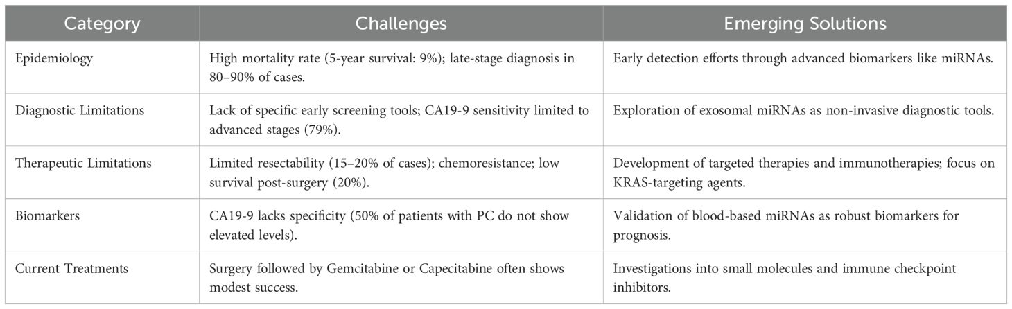 Because pancreatic cancer is so lethal and the seventh leading cause of cancer-related mortality in the world, in part, because of its poor prognosis. There is still early diagnosis as a major problem in clinical practice, and the existing biomarkers for early detection of pancreatic cancer are still imperfect (49). miRNAs are small, non-coding RNAs that post transcriptionally regulate gene expression by binding to complementary sequences in the targets mRNAs and leading to translational repression and/or mRNA degradation; therefore, they represent new classes of potential novel biomarkers for early pancreatic cancer detection (85). Since exosomal miRNAs have been detected in biofluids such as blood, urine, and saliva, many studies aimed to understand the roles of exosomal miRNAs in various types of carcinomas (86). By 2030, pancreatic cancer is projected to be the second leading cause of cancer related death. The disease is rapidly progressive, extends widely and early metastasizes, and is highly lethal (87, 88). Curative resection in pancreatic cancer patients is best treated with surgical treatment. Unfortunately, only a small fraction of patients (about 15-20%) are diagnosed with resectable pancreatic cancer; the majority come to us with locally advanced or metastatic disease (89). To better understand the diagnostic and therapeutic challenges in pancreatic cancer, the Table 1 provides a concise summary of the key issues and emerging solutions:
