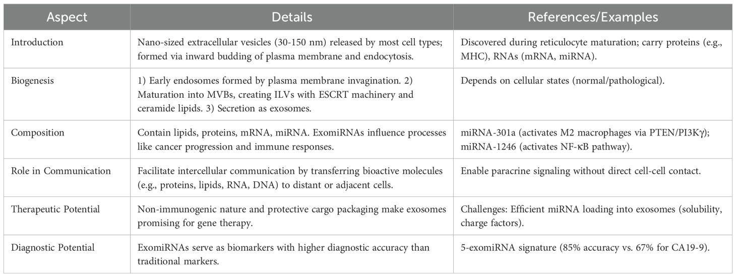 Exosomes are nano-sized extracellular vesicles (30-150 nm) which are released to the extracellular environment by most cell types. Mature endosomes are therefore multivesicular bodies formed from the inward budding of the plasma membrane and endocytosis (91). Exosomes were reported to package some proteins (MHC class I and II molecules) and RNAs (mRNAs and miRNAs) and then transfer them to adjacent or distant cells (92). Exosomes are critical for intercellular communication or crosstalk to deliver bioactive molecules, including protein, lipid, RNA, and DNA, to recipient cells to influence their physiological or pathological behavior (93). To provide a concise summary of exosomes’ biology and functions, the Table 2 highlights key aspects of their structure, biogenesis, and roles: