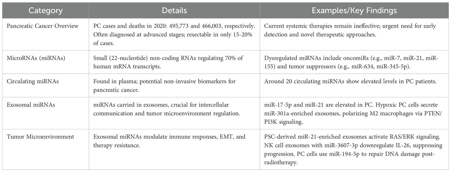 Pancreatic cancer (PC) is one of the malignancies with the worst prognosis, based on its late diagnosis. Only 12% survive 5 years, making the 5-year survival rate for all stages just 12% (49). According to GLOBOCAN 2024, pancreatic cancer accounts for approximately 2.6% of all new cancer cases and 4.8% of total cancer deaths worldwide, underscoring its disproportionate lethality. Exosome is a subtype of extracellular vesicles (EVs) with a size from 30 to 150 nm and a phospholipid bilayer structure (50). Exosomes are thought to be intercellular communicators, transferring between cells proteins, lipids, and nucleic acids (51). Recent studies show that tumor cells can induce the biogenesis and secretion of exosomes to form a tumor friendly immune microenvironment (52–54). Exosomes originating from pathologically altered parent cells have a distinct cargo which reflects the pathological state of the parent cells. Exosomal microRNAs (miRNAs) are more resistant to environmental stresses, and thus are potential noninvasive diagnostic and prognostic biomarkers of cancers, including PC, than other cargoes. These alarming epidemiological trends reinforce the need to explore molecular biomarkers such as exosomal miRNAs for early detection and better disease stratification.