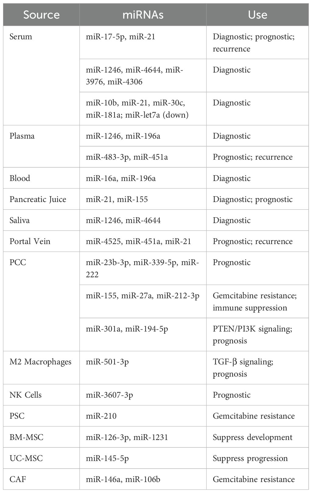 The increased serum levels of exosomal miR-17-5p and miR-21 was the baseline of the first study demonstrating diagnostic value of exosomal miRNAs in PC (156). Over the years, more research has been conducted, with many other exosomal miRNAs with diagnostic usefulness being discovered. For instance, exosomal miR-1246, miR-4644, miR-3976, and miR-4306 have all been documented to be elevated in PC patients (157). A multi-marker signature containing miR-10b, miR-21, miR-30c, miR-181a, as well as downregulated miR-let 7a, markedly surpassed classic exosomal markers like glypican-1 (158). Moreover, exosomal miR-451a is showing promise as a predictor for advanced disease and recurrence. Previous studies, emphasizes the presence of significant amounts of mir-196a and mir-1246 in PC exosomes and their elevation in plasma from patients with localized illness (159). Additionally, exosomal miRNAs from other sources such as pancreatic juice (miR-21, miR-155), saliva (miR-1246, miR-4644), and portal blood (miR-4525, miR-451a, and miR-21) have demonstrated potential for diagnostics as well as prognostics (132).