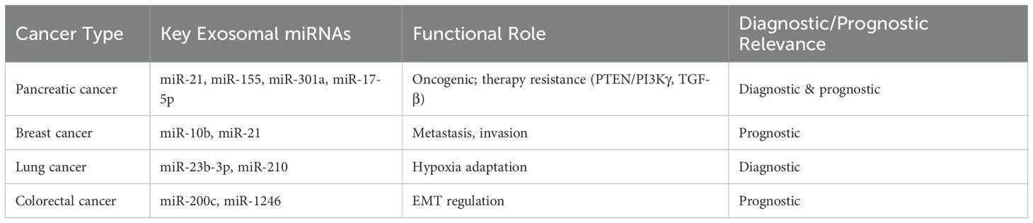Comparative Landscape of Exosomal miRNAs in Pancreatic and Other Cancers A comparative perspective underscores both shared and disease-specific exosomal miRNA signatures across malignancies. For instance, miR-21 and miR-155 are ubiquitously upregulated in pancreatic, breast, and lung cancers, reflecting their generalized oncogenic role. However, miR-1246 and miR-301a exhibit relatively higher specificity for pancreatic cancer, mediating macrophage polarization and therapy resistance. Table 5 summarizes the most reported exosomal miRNAs across key cancer types, outlining their diagnostic and functional implications.