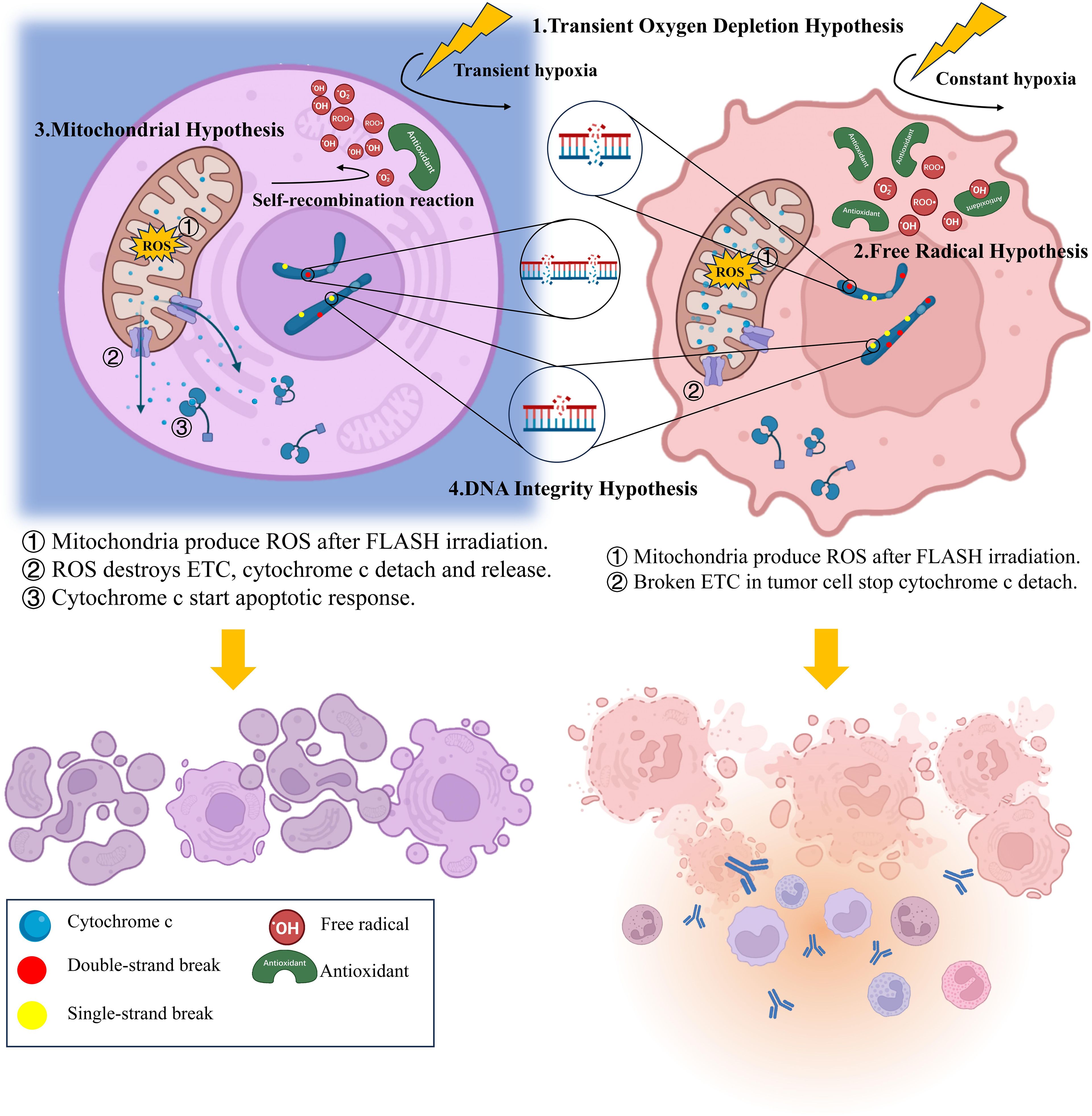 Elucidating the mechanisms underlying the FLASH effect serves not only to clarify the complex interrelationships among influencing factors, but also to establish the theoretical foundation for FLASH-RT’s clinical applicability. Among current hypotheses, only the oxygen depletion, free radicals, DNA integrity, and mitochondrial hypotheses provide relatively comprehensive molecular-level explanations of the FLASH effect. The remaining hypotheses are mostly confined to the cellular level, offering supplementary evidence rather than fundamental mechanistic insights. In subsequent studies, further research is needed to investigate these cellular-level hypotheses and delve into their molecular mechanisms.