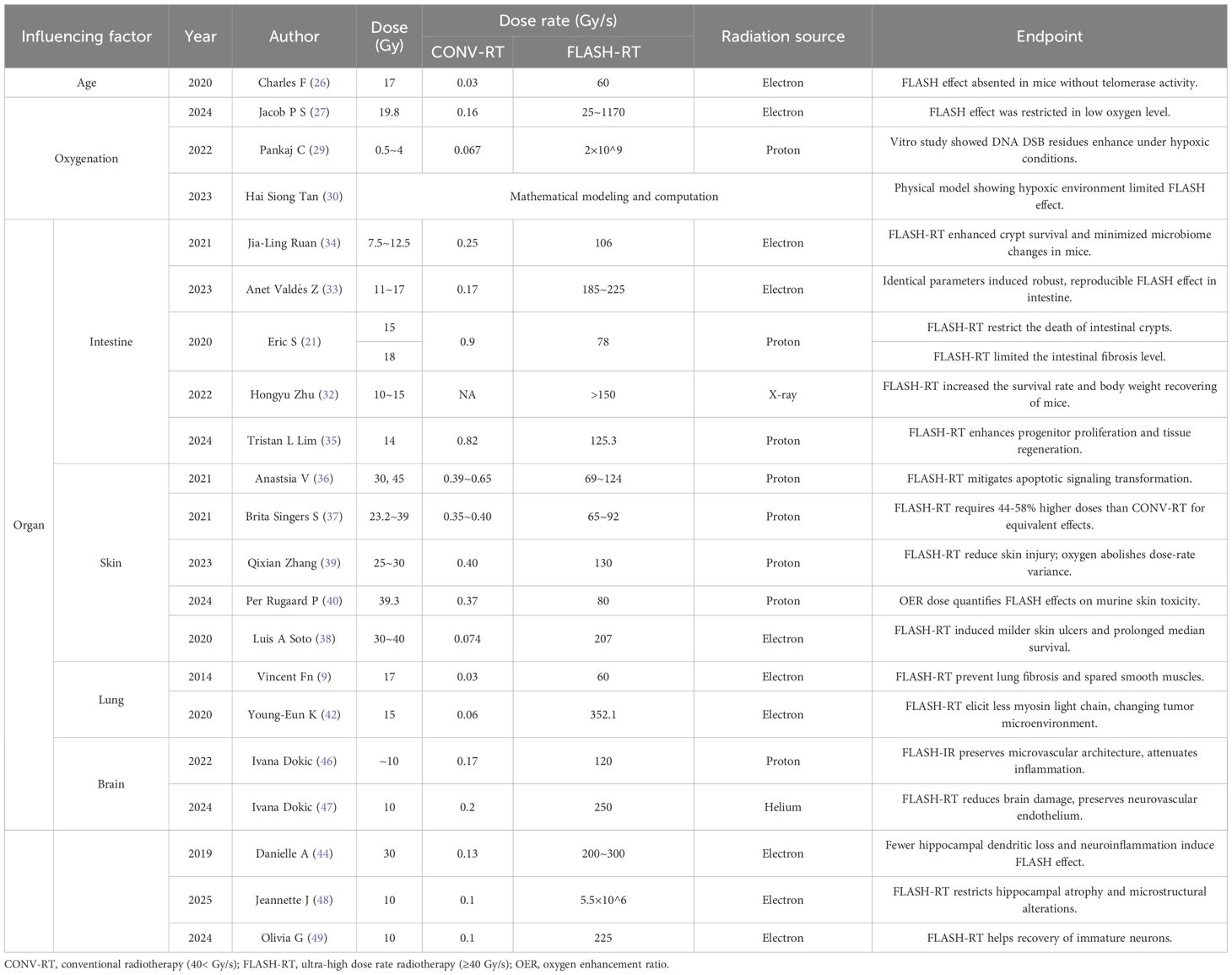 Moreover, among different tissues, FLASH effect also demonstrates with varying intensity levels and distinct manifestation patterns. This variability is primarily related to the diverse oxygenation levels and mitotic activity in different organs and tissues, which lead to their differential radiosensitivity. Generally, tissues with higher radiosensitivity are more susceptible to radiation damage, which may make the protective effect of FLASH effect more pronounced. Consequently, this leads to significant variations in the conventional irradiation parameters required to achieve the FLASH effect across distinct tissues. Meanwhile, the manifestation of FLASH effect also varies according to the type of irradiated tissue or organ (Table 2).