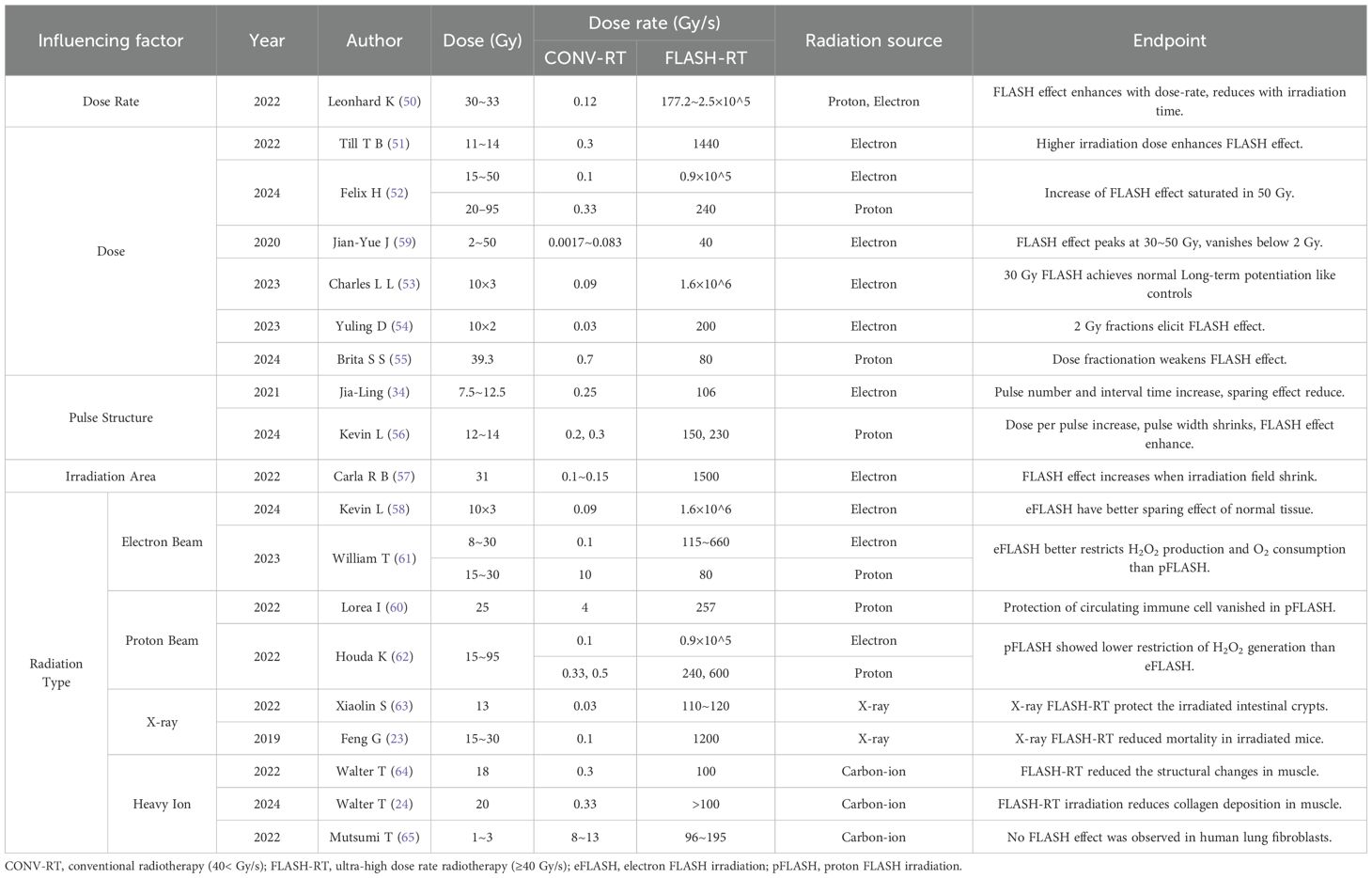 In terms of physical factors, the FLASH effect is predominantly influenced by radiation dose, dose rate, pulse structure characteristics, irradiation field, as well as the type of radiation employed (Table 3). For dose rate, research on zebrafish embryo showed that higher dose rate (>40 Gy/s) and shorter irradiation time can significantly reduce the incidence of malformations (50). Further studies proved this conclusion and pointed out that the radioprotective efficacy of FLASH effect also increased with higher irradiation dose (51, 52). However, this increase tends to reach saturation around 50 Gy (52) and the whole protection capability will be almost negligible below 2 Gy (59). These findings not only proved that the flash effect is determined by both dose and dose rate parameters, but also provided a guidance on fractionation regimens for FLASH-RT. Existing experiments have demonstrated that standard fractionated FLASH-RT (2 Gy/fraction) still present FLASH effect (53, 54), although the intensity is likely to be reduced (55). The specific mechanism underlying this reduction is not yet clear, but it can typically be mitigated by increasing the dose per fraction (51).