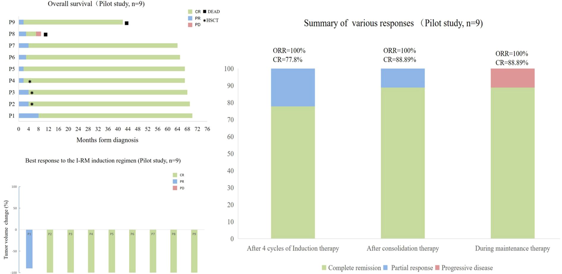 Results: After induction, overall response rate (ORR) was 100% (complete response [CR]: 77.8%, partial response [PR]: 22.2%). Post-consolidation, CR increased to 88.9%. At a median follow-up of 77.6 months, 5-year overall survival (OS) and progression-free survival (PFS) rates were both 77.8%, with 8 patients in sustained CR and one progression. No treatment-related deaths occurred; grade ≥3 adverse events were rare (2 neutropenia, 2 anemia, 1 gastrointestinal bleeding).
