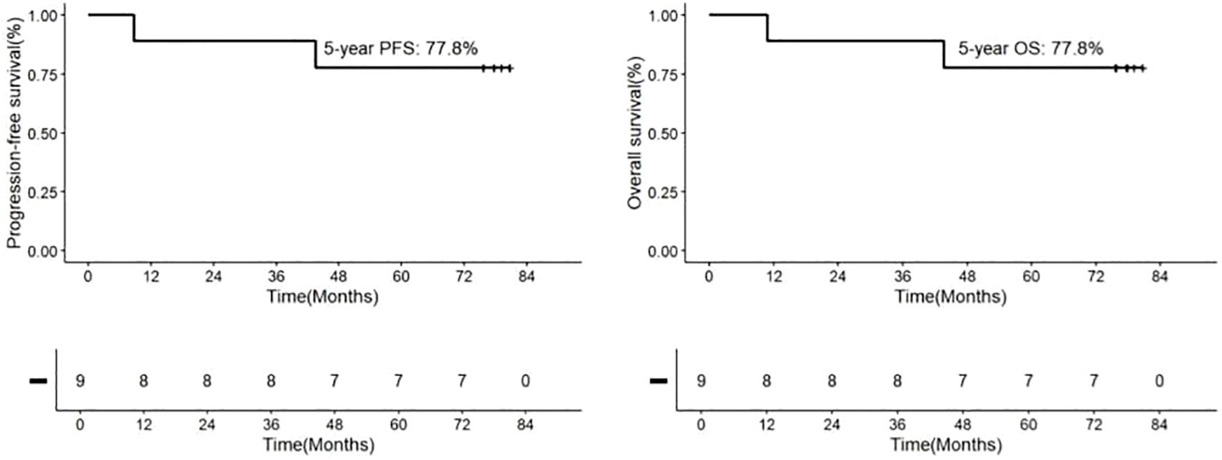 Following consolidation therapy, 8 out of 9 evaluable patients achieved CR, accounting for 88.9% of the cohort. Among the 9 patients, 8 chose maintenance therapy, while 1 patient did not receive lenalidomide or ibrutinib for maintenance due to proteinuria and a kidney biopsy suggesting autologous HSCT-related thrombotic microangiopathy (TMA) (23). During the maintenance therapy phase, one patient achieved CR from PR, while another patient had a sudden progressive and subsequently passed away 10.8 months after the initial diagnosis. Additionally, one patient died from a non-progressive-related grand mal seizure after the discontinuation of lenalidomide maintenance therapy and one year of oral sodium valproate, 43.6 months after the initial diagnosis. One patient discontinued the maintenance therapy due to other medical conditions. In summary, among the 9 newly diagnosed PCNS DLBCL patients, the final response included 8 cases of CR (88.9%) and 1 case of PD (11.1%) (Figure 1 and Table 2). Median PFS and OS were not reached and the 5-year OS and PFS were 77.8% and 77.8% respectively (Figure 2).