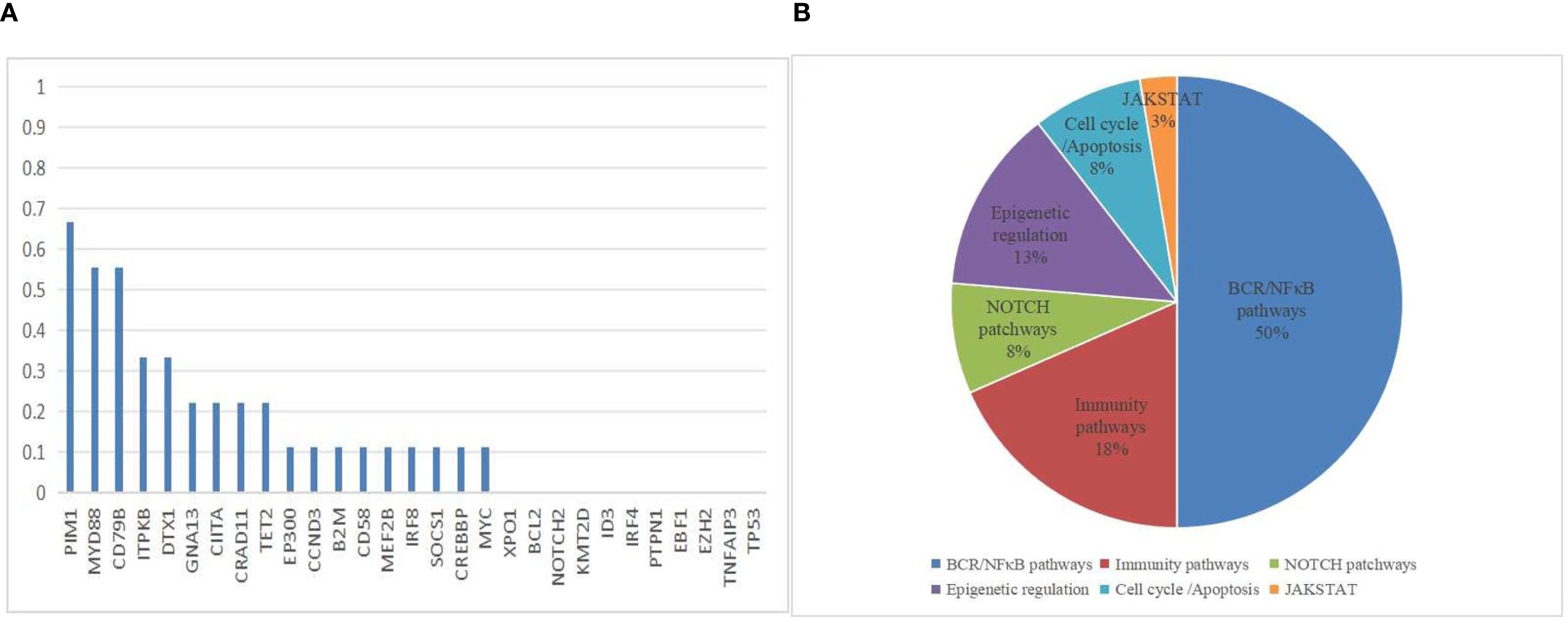 Figure 3. Mutation Frequencies in PCNSL Cohort. (A) The distribution and frequency of genetic alterations in 9 PCNSL specimens. (B) Mutation pathway distribution among PCNSL specimens. Different colors represent diverse mutation pathways.