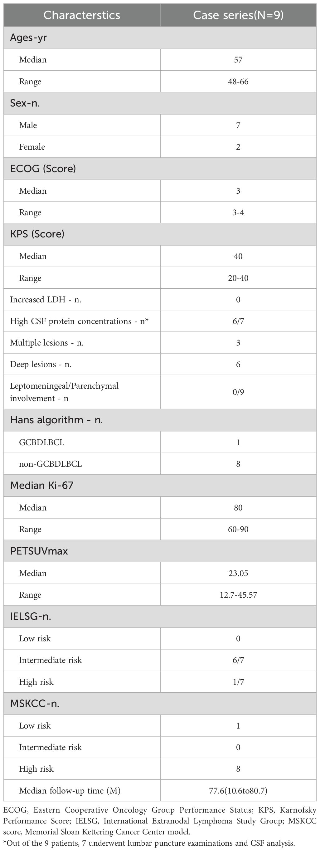 In this pilot study, a total of 9 patients, comprising 7 men and 2 women, were included. The median age at the time of diagnosis was 59 years (48-66), and the median Karnofsky Performance Status (KPS) score was 40 (20-40).The low KPS scores observed in some patients (as low as 20) were attributable to tumor-related neurological deficits rather than systemic comorbidities; all patients had adequate major organ function and were thus eligible for intensive chemotherapy. Deep brain structure involvement was observed in six patients (66.9%). Pathological diagnosis confirmed that all patients had DLBCL, with 8 classified as non-GCB subtypes and 1 as GCB subtype. The median follow-up time was 77.6 (10.6 to 80.7) months (Table 1).