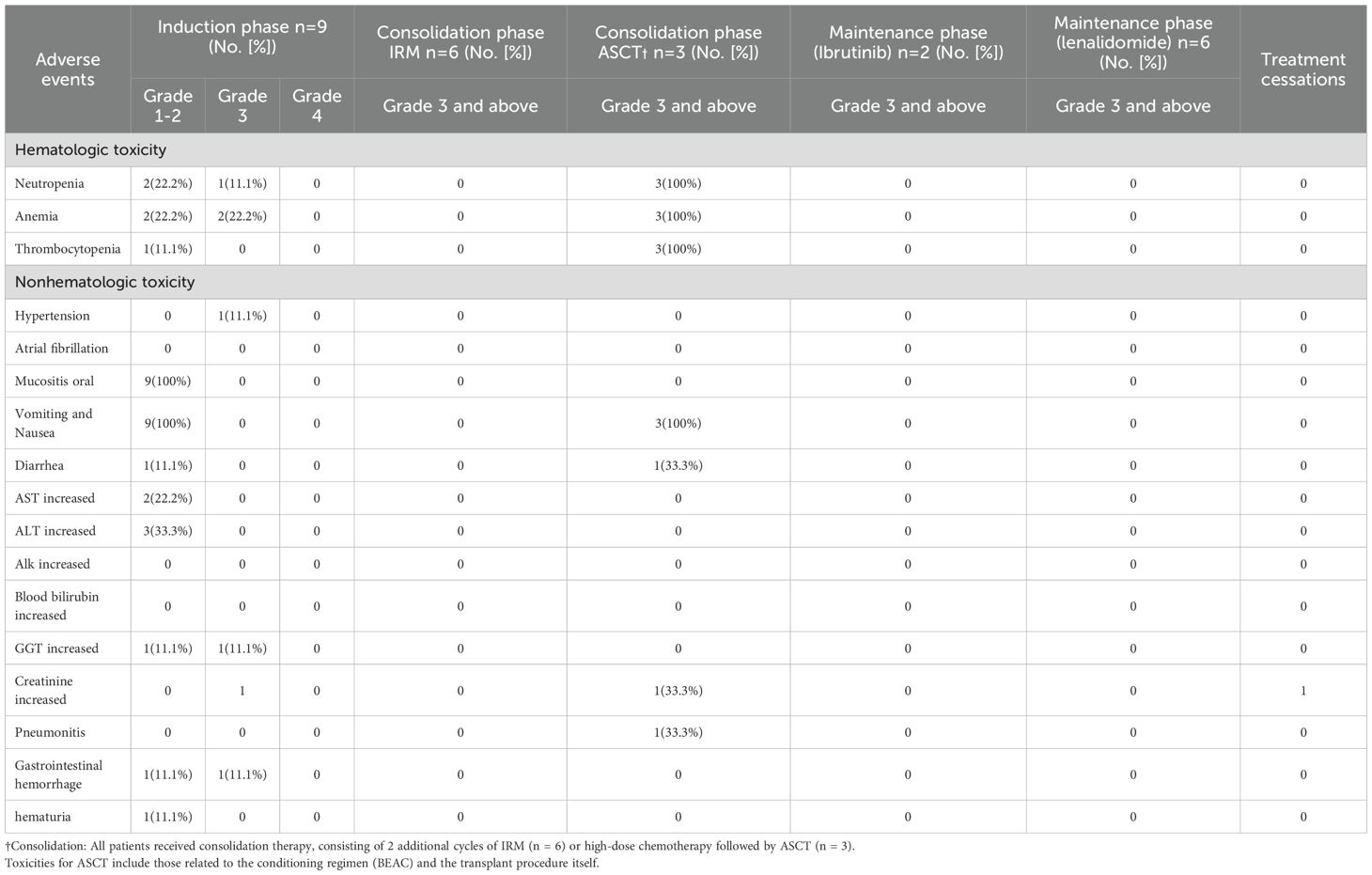 No treatment-related deaths occurred in patients who received IRM induction therapy and additional IRM consolidation cycles. The incidence of grade ≥3 treatment-related adverse events across different treatment phases is detailed in Table 3. Overall, the regimen was well-tolerated. During the induction phase, toxicity was primarily hematologic, including grade 3 neutropenia in 2 patients (22.2%) and grade 3 anemia in 2 patients (22.2%); non-hematologic toxicity included one case (11.1%) of grade 3 gastrointestinal hemorrhage associated with concomitant rivaroxaban use. Among the three patients undergoing consolidation with autologous stem cell transplantation (ASCT), all (100%) developed grade 3 neutropenia. Non-hematologic toxicities during the consolidation phase included pneumonitis, diarrhea, and elevated creatinine, each occurring in one patient (11.1%). In contrast, no grade ≥3 hematologic toxicities were observed in the six patients who received IRM consolidation. During the maintenance phase, toxicities were less frequent and manageable; one patient on lenalidomide developed grade 3 anemia, and one patient on ibrutinib required a dose reduction due to grade 3 limb pain. No cases of fungal infection or atrial fibrillation were observed in any phase. One patient did not receive maintenance therapy due to proteinuria and a kidney biopsy suggestive of transplant-associated thrombotic microangiopathy.