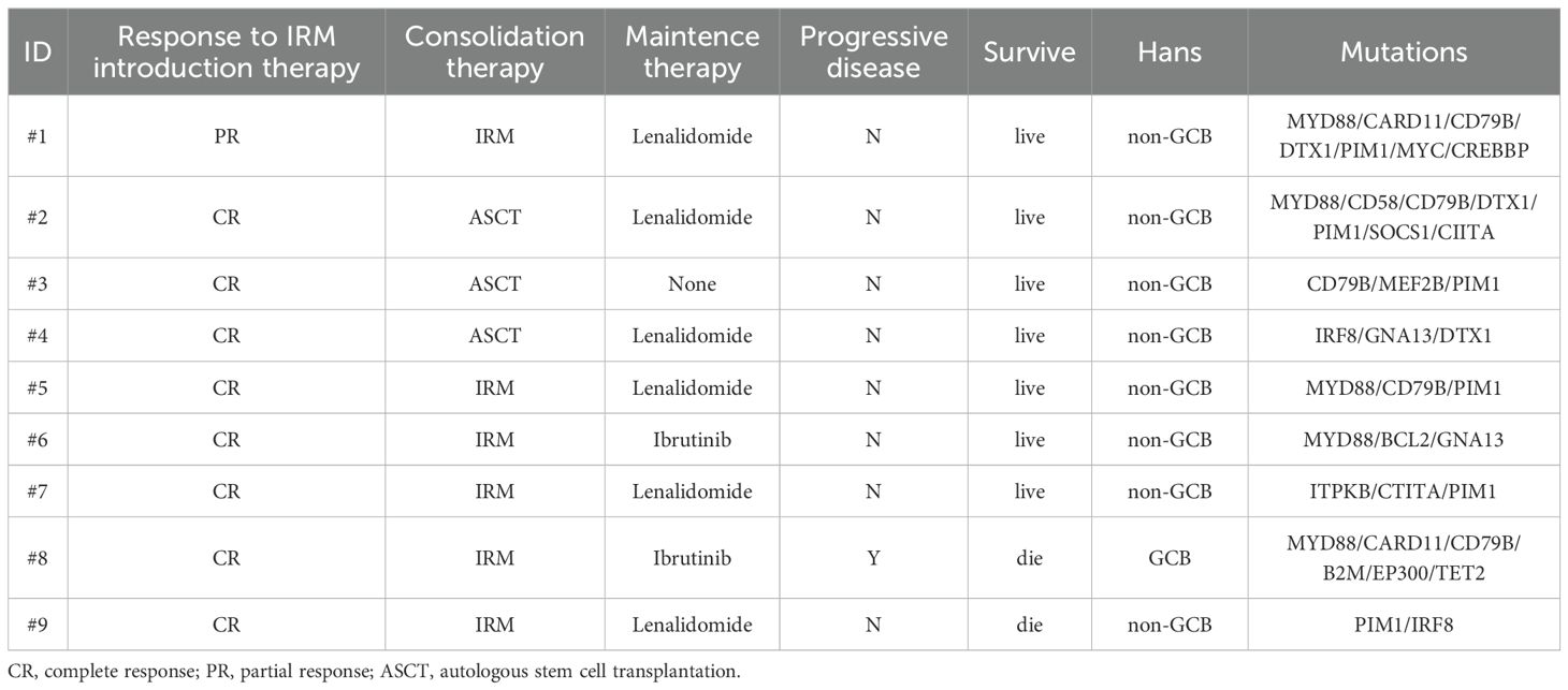 This study has several limitations, including its small sample size (n=9), retrospective design, and lack of a control group. These factors may introduce selection bias and limit the generalizability of our findings. Additionally, the heterogeneity of molecular subtypes within our cohort, such as the case of a patient classified as MCD by NGS but GCB by Han’s classification, highlights the need for further investigation into the relationship between genetic subtypes and treatment response. Furthermore, due to the retrospective design of our study, standardized assessments of quality of life and cognitive function were not available, which limits our evaluation of the regimen’s impact on these important patient-centered outcomes. Although the IRM regimen appeared to be well-tolerated without severe myelosuppression-related complications such as major infections or hemorrhage—suggesting a potentially more favorable quality of life compared with conventional chemotherapy—this remains an observational impression rather than a systematically measured outcome. Prospective collection of these data will be incorporated into our future studies to provide a more comprehensive understanding of the treatment’s effects. Additionally, the heterogeneity in consolidation therapy (ASCT in 3 patients vs. additional cycles of IRM in 6 patients), while reflecting real-world clinical practice, may have introduced confounding factors in the long-term outcome analysis.