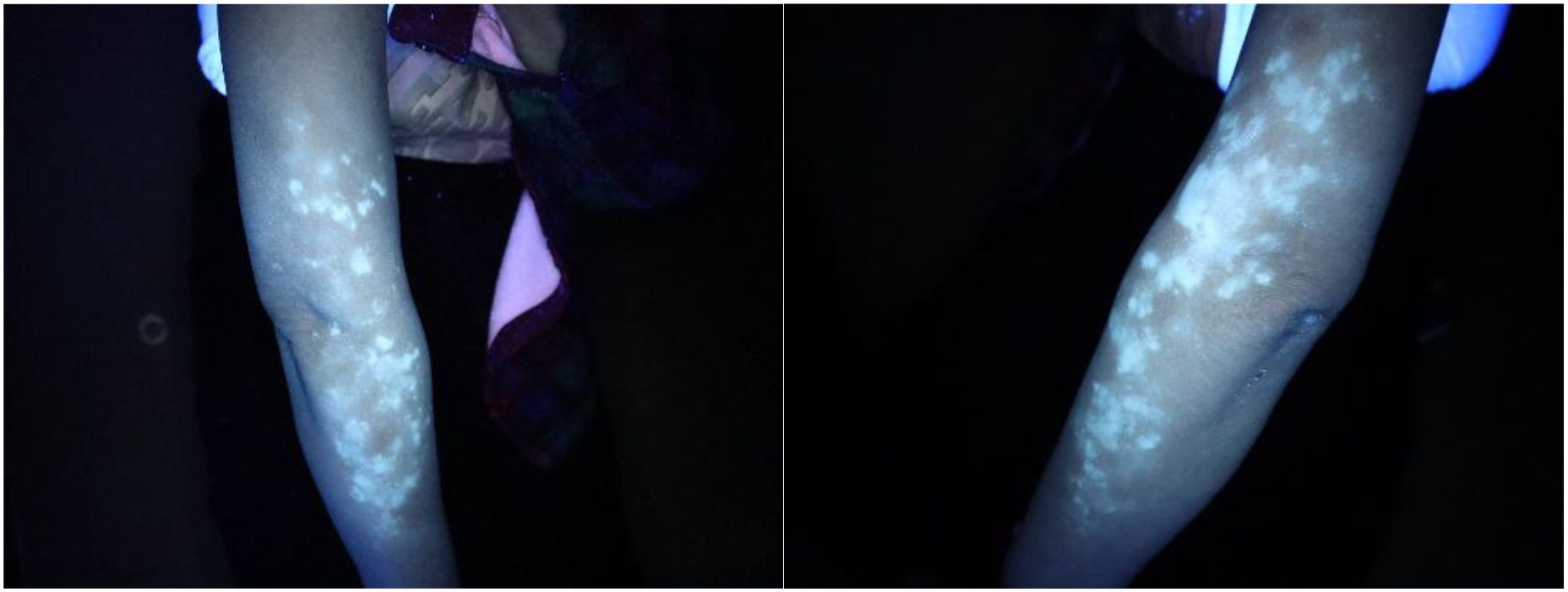 Sixteen months after the start of treatment, pruritus appeared on the forearm, accompanied by depigmented spots. The patient herself and her family had no previous history of autoimmune diseases. Dermoscopy showed: pigment disappearance in the lesion area, deepened pigment around the lesion, and telangiectasia, suggesting vitiligo (see Figure 1). Immunofluorescence and Wood’s lamp examination showed bright blue-white fluorescence(see Figure 2). She was treated with 0.1% mometasone cream and 0.1% tacrolimus ointment. The follow-up after 2 months showed stable condition, and no new lesions appeared in other parts.