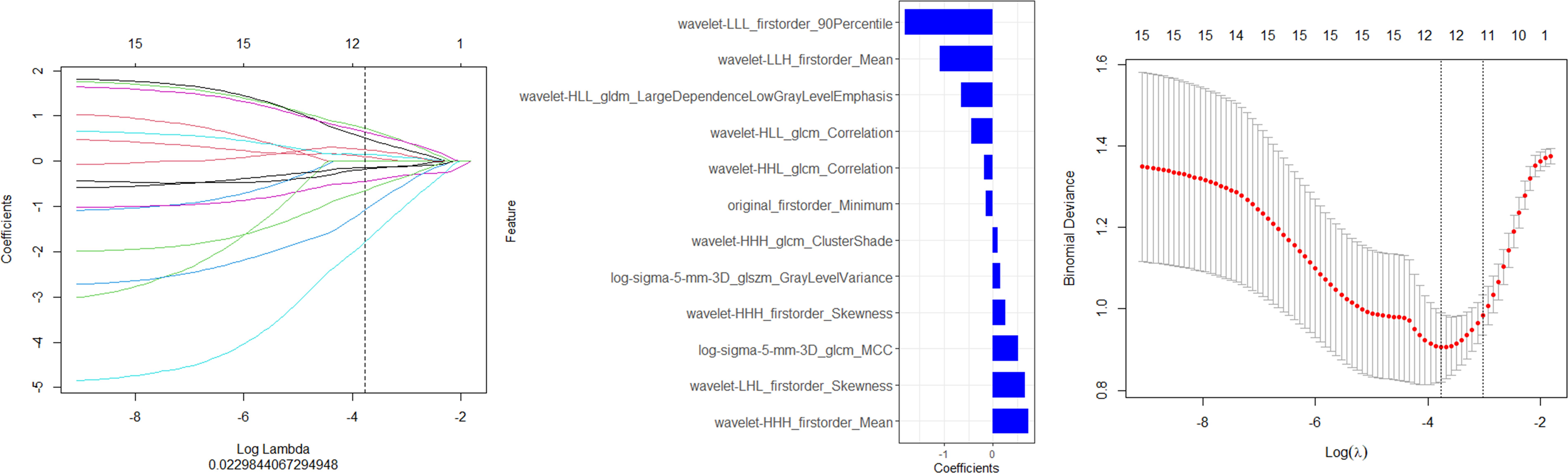 Figure 1. Screening of the radiomics features in the training set via LASSO regression. (A) Features maintaining non-zero coefficients at the (A) 1se threshold (vertical dashed line) in LASSO regression analysis." (B) The final feature subset with non-zero coefficients selected by LASSO regression at the optimal penalty parameter (A. 1se) (C) The optimal regularization parameter (A. 1se) was determined through cross-validation, as indicated by the vertical dashed line on the right.