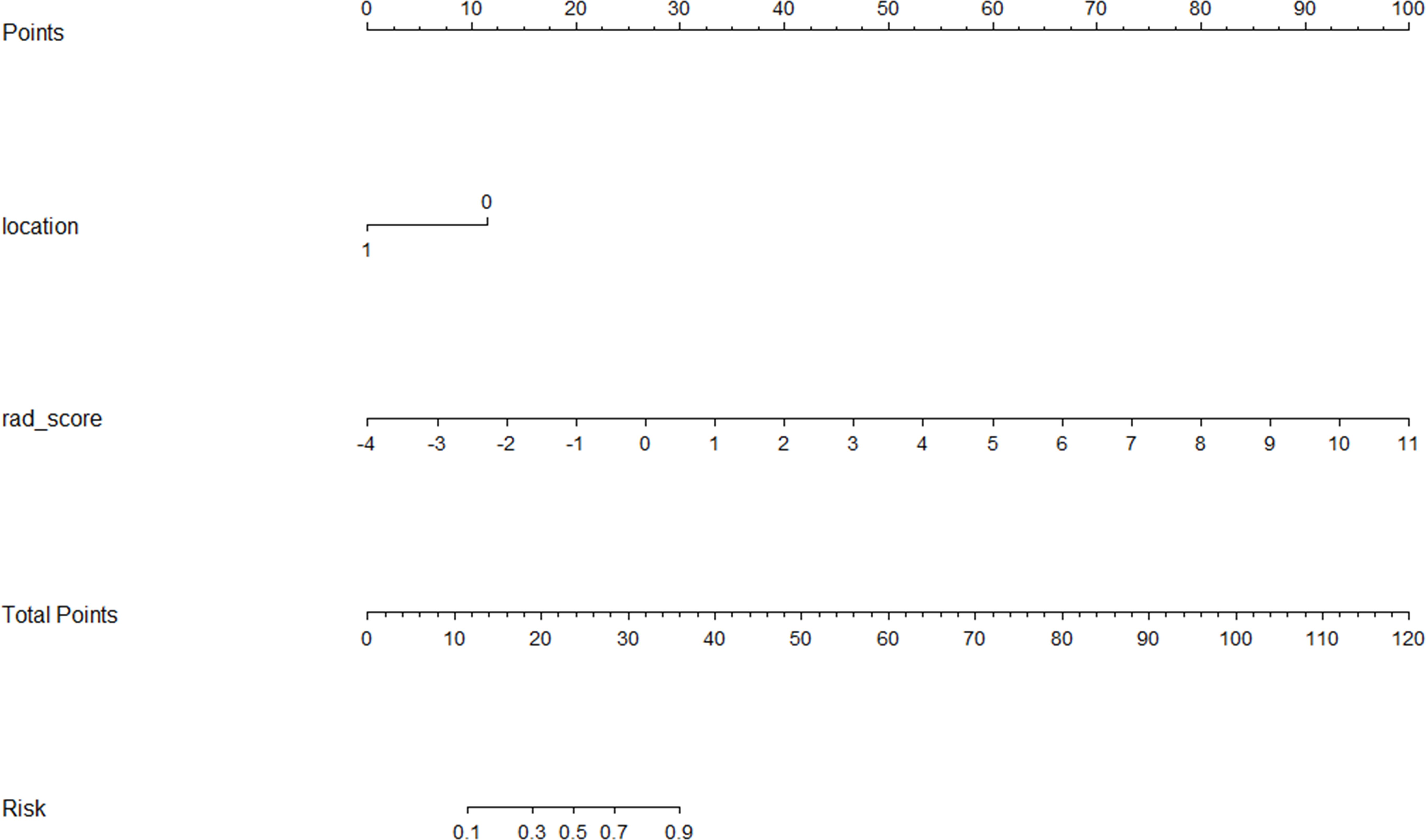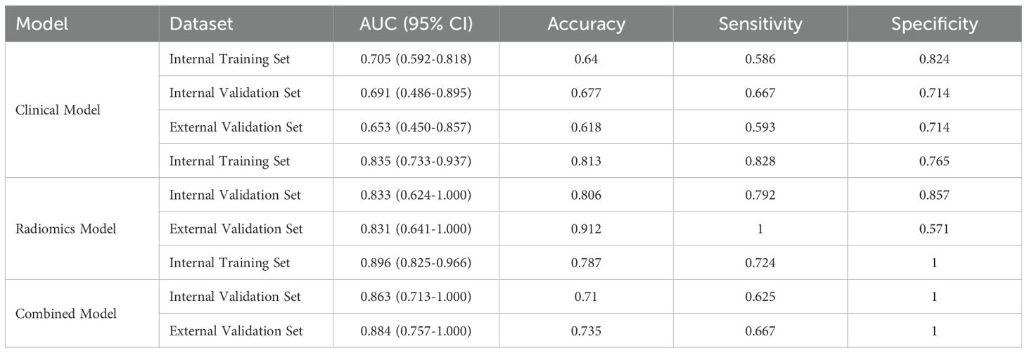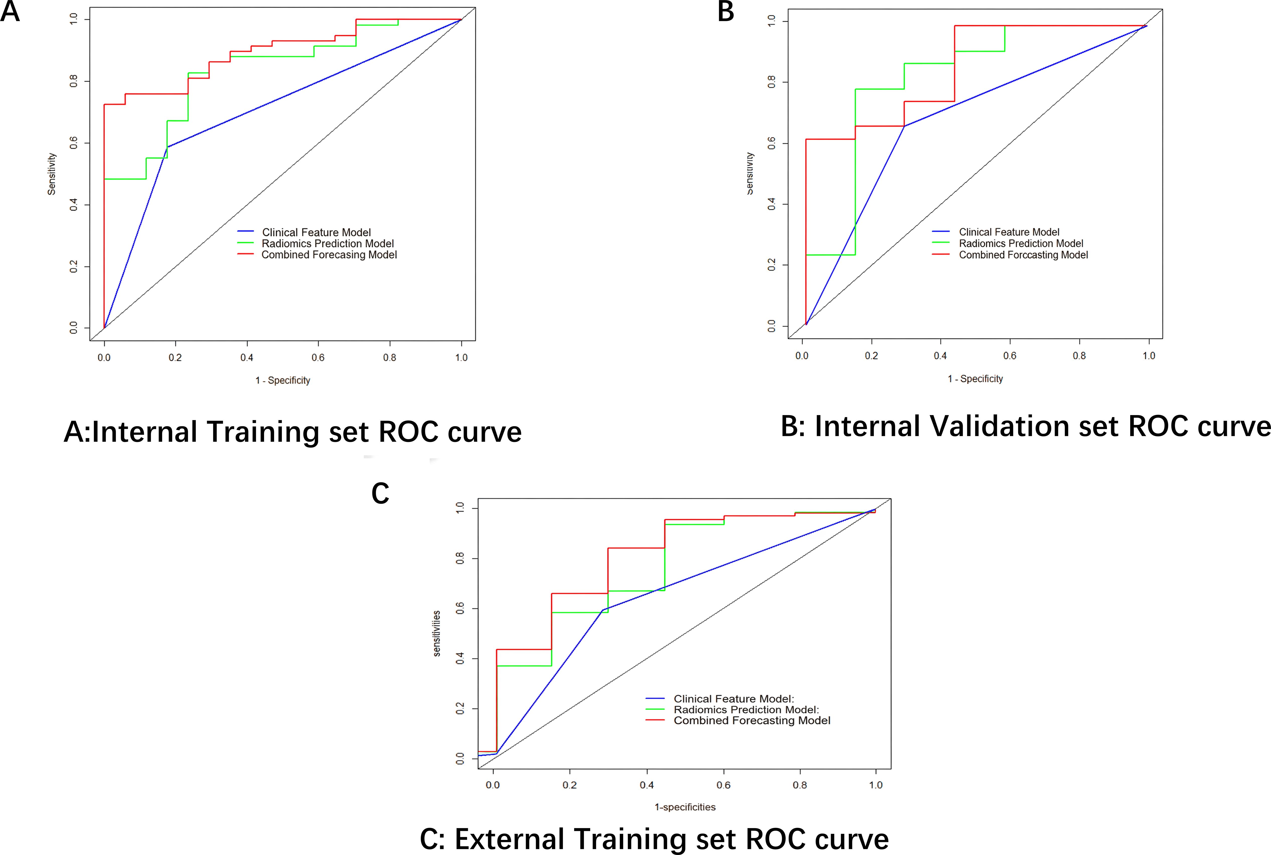 The independent clinical predictors and the radiomics score (Rad-score) were integrated into a final multivariate logistic regression analysis to construct the Combined Forecasting Model (CFM). A nomogram was generated to visualize this model. The performance of all models was evaluated using several metrics. Receiver Operating Characteristic (ROC) curves were used to assess discriminative ability, calibration curves were used to evaluate model reliability, and Decision Curve Analysis (DCA) was used to assess the net clinical benefit and clinical utility the independent predictors and radiomics scores were included in the multivariate logistic regression analysis, and a combined model was constructed based on this, and a nomogram was drawn. The ROC curve was used to evaluate CFM, the calibration curve was used to evaluate the reliability of the model, and the DCA was used to evaluate the clinical efficacy of the radiomics model and CFM.