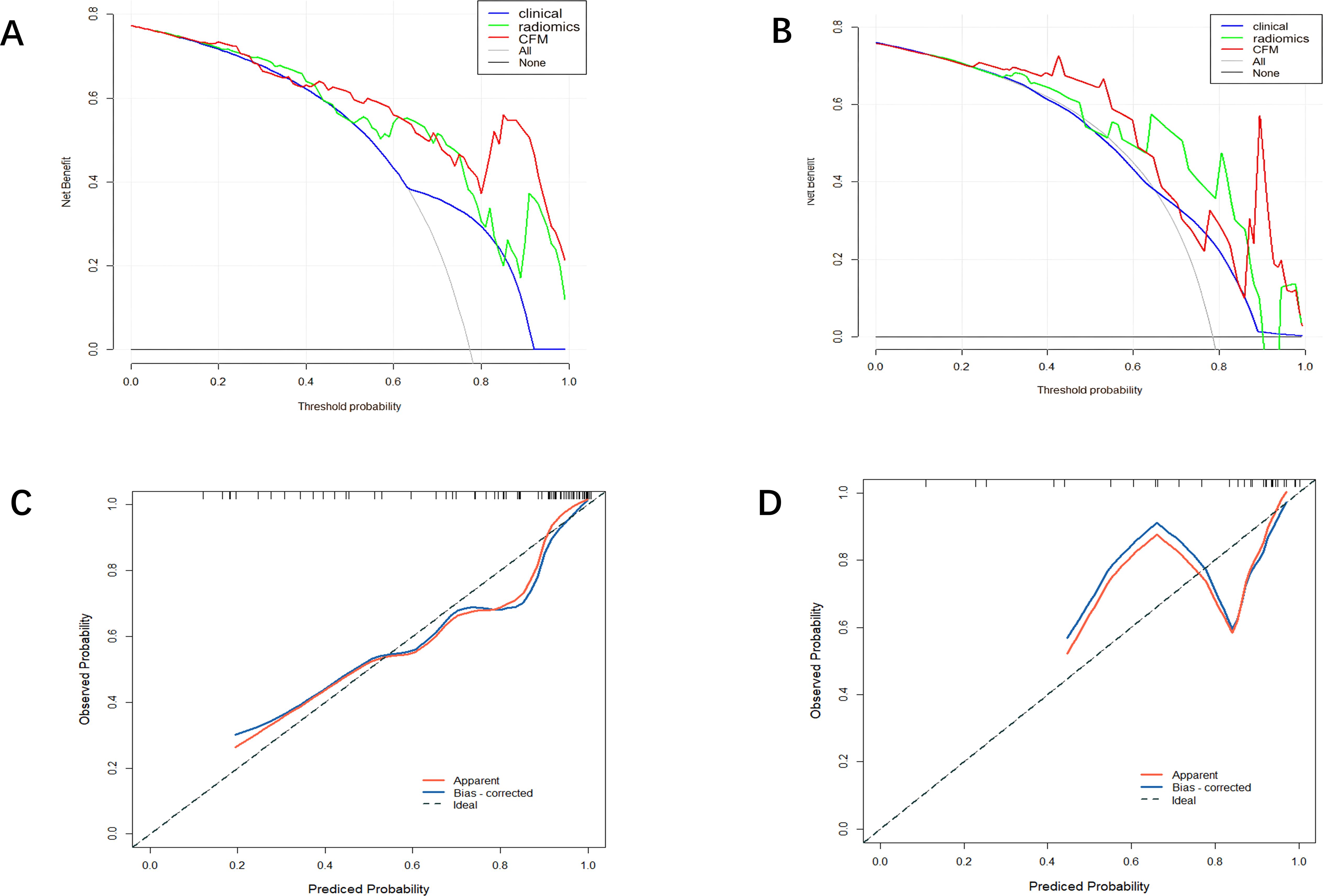 Figure 4. (A) Training set DCA curve (B) Validation set DCA curve (C) Calibration curve of the comprehensive forecasting model in the training set. (D) Calibration curve of the comprehensive forecasting model in the test set.