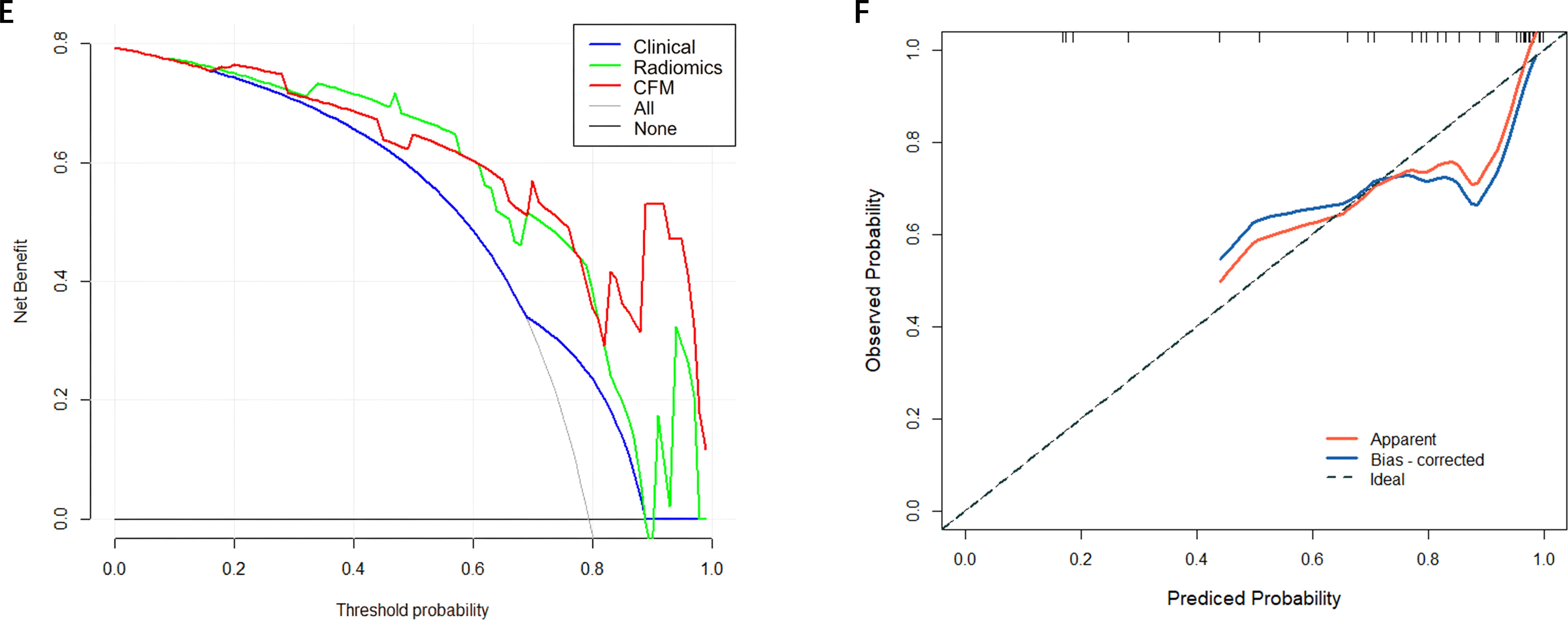 Figure 5. (E) External Validation DCA curve (F) Calibration curve of the comprehensive forecasting in the External Validation.