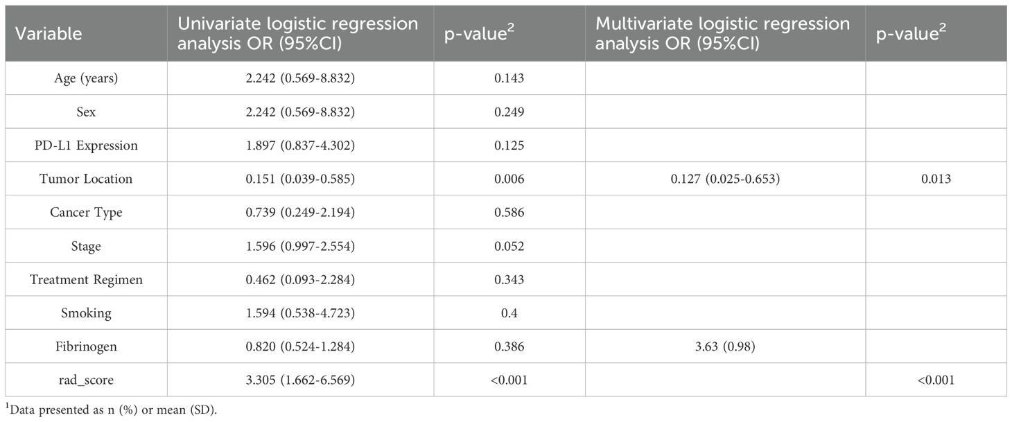 The advent of immune checkpoint inhibitors (ICIs) has revolutionized the treatment paradigm for advanced non-small cell lung cancer (NSCLC), with approximately 20-30% of patients achieving durable responses (1). However, the current gold-standard biomarker PD-L1 expression exhibits limited predictive accuracy (objective response rate concordance: 45-60%) (2, 3), while emerging biomarkers like tumor mutational burden (TMB) face challenges in clinical standardization (4–6). This predictive uncertainty leads to non-negligible rates of premature treatment discontinuation (34.7% in real-world studies (7)) and unnecessary immune-related adverse events (irAEs),highlighting the urgent need for more robust stratification tools. Radiomics, as a non-invasive approach decoding tumor heterogeneity through high-throughput imaging feature analysis, has demonstrated unique advantages in ICI response prediction. Recent studies revealed that CT-based radiomic signatures could reflect tumor microenvironment characteristics (e.g., CD8+ T-cell infiltration (8)) and predict progression-free survival (PFS) with AUCs of 0.71-0.79 (9, 10).By extracting quantitative radiomics features from patient CT images and computing the radiomics signature, combined with selecting predictive clinical indicators from patient medical records, we developed and validated a Combined Forecasting Model (CFM) to predict treatment response to immunotherapy in non-small cell lung cancer (NSCLC) patients.
