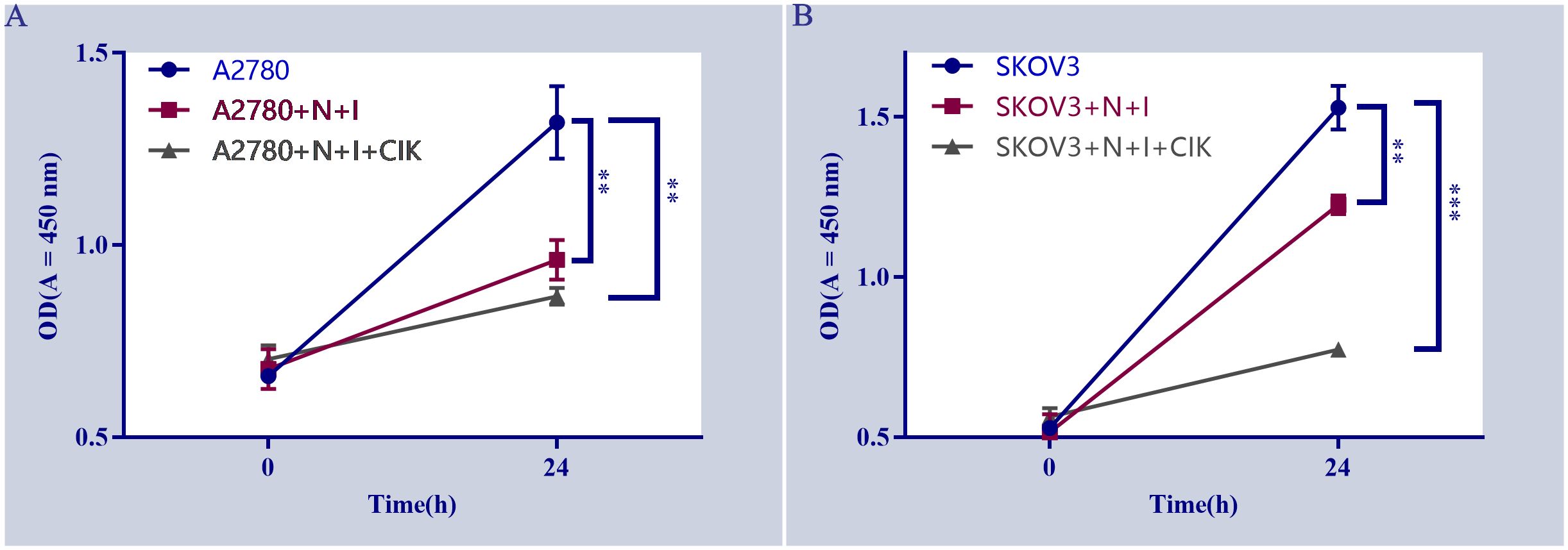 Figure 1. Effects of different treatments on cell proliferation. (A) Proliferation of A2780 cells under indicated treatments (A2780: untreated cells, A2780+N+I: A2780+Nivolumab+Ipilimumab, A2780+N+I+CIK: A2780+Nivolumab+Ipilimumab+CIK cells. (B) Proliferation of SKOV3 cells under indicated treatments (SKOV3, SKOV3+N+I, SKOV3+N+I+CIK). Cell proliferation was assessed by measuring OD values at 450 nm. n=3, **=0.004, **=0.0006, **=0.002, **=0.0001 vs. control group.