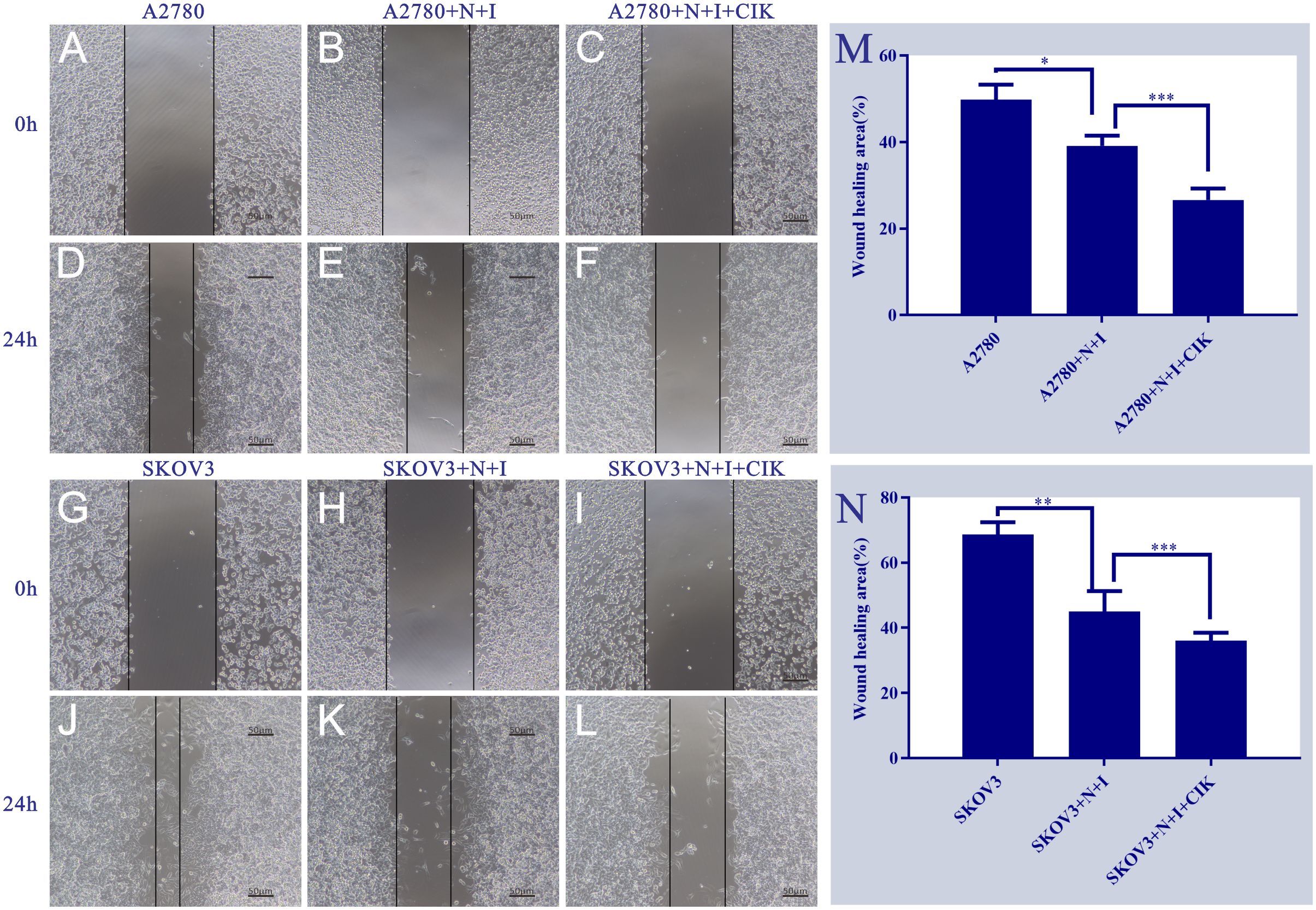 Figure 3. Effects of different treatment groups on A2780 and SKOV3 cells. This figure shows the morphological/distributional characteristics of two cell lines (A2780 and SKOV3) under different treatment conditions and time points, observed under a light microscope. Panels (A. D) are the control groups of A2780 cells at 0h and 24h, respectively; Panels (B, E) represent the A2780+N+I treatment group at 0h and 24h, while Panels (C, F) denote the A2780+N+I+CIK treatment group at 0h and 24h. Panels (G, J) are the control groups of SKOV3 cells at 0h and 24h, respectively; Panels (H, K) represent the SKOV3+N+I treatment group at 0h and 24h, while Panels (I, L) denote the SKOV3+N+I+CIK treatment group at 0h and 24h. The scale bar for all images is 50μm. Quantitative analysis of relative wound closure: (M) A2780 cells; (N) SKOV3 cells; n=3, *=0.01, **=0.007, **=0.005, ***=0.0002 vs. respective group at 24 h.