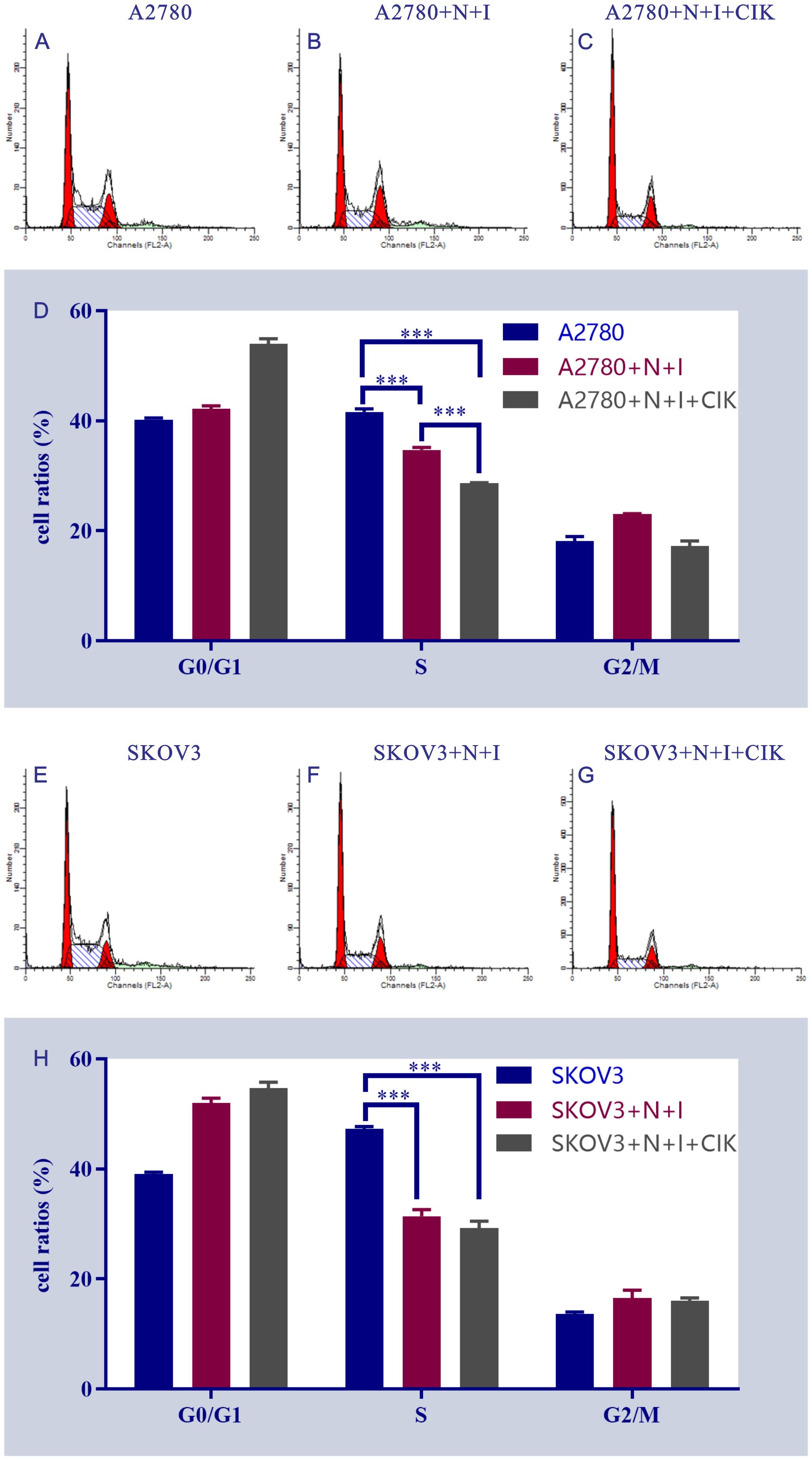Figure 5. Flow cytometry analysis of cell cycle distribution in A2780 and SKOV3 cells under different treatment conditions. This figure shows the results of flow cytometry analysis, including a series of scatter plots and bar charts (subpanels A-H), which are intended to present the cell cycle distribution and characteristics of related fluorescent signals of A2780 and SKOV3 cells after different treatments. All subpanels focus on the analysis of the control group, N+I treatment group (cell line + N+I), and N+I+CIK combined treatment group (cell line + N+I+CIK). (A-D): For A2780 cells, subpanels (A–C) are flow cytometry scatter plots of the control group (A), A2780+N+I treatment group (B), and A2780+N+I+CIK treatment group (C), respectively, reflecting the distribution of cell-related fluorescent signals. Subpanel (D) is a bar chart of cell cycle distribution for each treatment group of A2780 cells; the y-axis represents cell proportion (%), showing the differences in cell proportion among G0/G1 phase, S phase, and G2/M phase. (E–H): For SKOV3 cells, these subpanels cover the control group (E), SKOV3+N+I treatment group (F), and SKOV3+N+I+CIK treatment group (G), including flow cytometry scatter plots and a cell cycle bar chart (H), focusing on the changes in cell cycle progression among G0/G1 phase, S phase, and G2/M phase. n=3,***<0.0001, ***<0.0001, ***<0.0001, ***<0.0001, ***<0.0001, vs respective group.