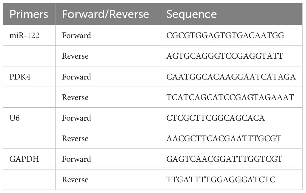 The total RNA in SKOV-3 and CAOV3 cells was extracted using the TRIzol reagent (Cat., 15596026). Following RNA purity and concentration determination, based on the following reaction conditions, 25°C for 10 min and 0 cycle, 42°C for 15 min and 0 cycle, 85°C for 5 min and 1 cycle, and 4°C for 1 min and 1 cycle, the reverse transcription was conducted using the miRNA 1st Strand cDNA synthesis kit (by tailing A) (Cat., MR201-01) for miRNAs and the HiScript II 1st Strand cDNA synthesis kit (Cat., R211-01, Vazyme, Nanjing, China) for mRNAs. Based on the following reaction conditions, 95°C for 10 min and 0 cycle, 95°C for 0.25 min and 50 cycles, 60°C for 1 min and 50 cycles, 95°C for 0.25 min and 0 cycle, 60°C for 1 min and 0 cycle, and 95°C for 0.25 min and 0 cycle, the real-time PCR was performed using the miRNA Unimodal SYBR qPCR Master Mix (Cat., MQ102-01) for miRNAs and the ChamQ Universal SYBR qPCR Master Mix (Cat., Q711-02) for mRNAs. All kits were obtained from Vazyme (Nanjing, China). The relative levels of miR-122 and PDK4 mRNA were calculated using the 2-ΔΔCt method. The primer sequences were listed in Table 1, among which U6 and GAPDH were the endogenous controls of miR-122 and PDK4.