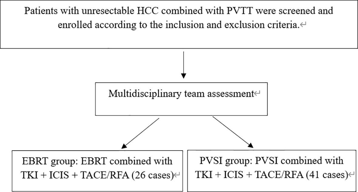 Systemic therapy included TKIs (lenvatinib, donafenib, or sorafenib) administered per guidelines, paused three days before and after intervention. ICIs (camrelizumab, tislelizumab, or sintilimab) were infused at 200 mg every three weeks. All patients received at least one cycle (3–4 weeks) of systemic therapy with TKI plus ICI before local treatment (EBRT or PVSI), ensuring an initial systemic response before commencing local intervention. Commonly used first-line TKI combined with ICI regimens include "Lenvatinib + Tislelizumab", "Sintilimab + Sorafenib", and "Apatinib + Camrelizumab". Discontinue treatment upon disease progression, intolerable adverse reactions, or patient withdrawal of consent. Adjuvant TACE or RFA was completed within one month post-PVSI or EBRT. For patients with hepatocellular carcinoma presenting with portal vein tumor thrombosis, the choice between external beam radiotherapy and portal vein stent implantation depends on specific clinical indications, tumor anatomy, and hepatic functional reserve. This determination was made following evaluation by a multidisciplinary team in accordance with established consensus guidelines. Such a collaborative decision-making approach reflects our institutional standard of care. All patients receive comprehensive counseling regarding the potential benefits and risks of each treatment option, tailored to their individual disease status. The final treatment plan incorporates both the multidisciplinary team’s recommendation and the patient’s fully informed consent. (Figure 1).