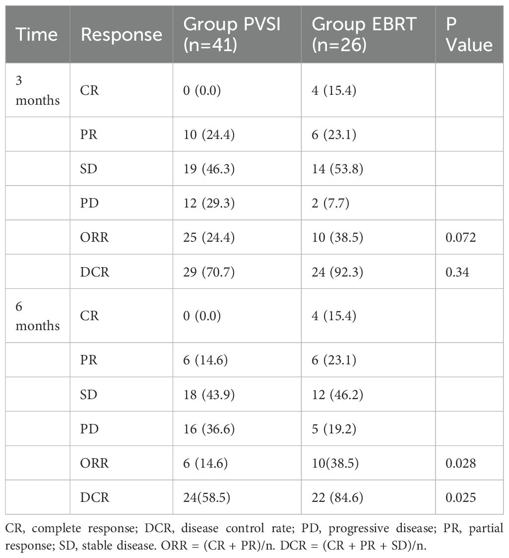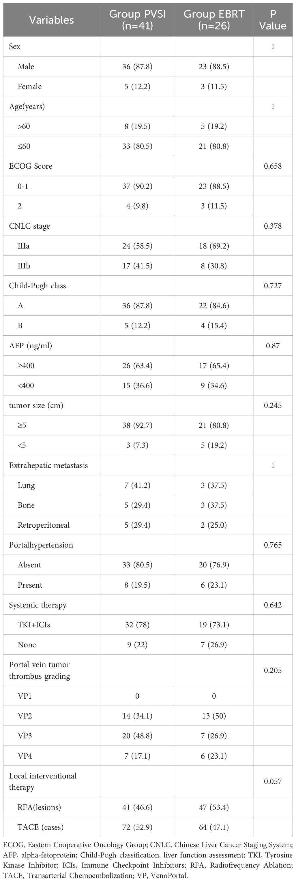 Results: This study enrolled 67 patients (26 in the EBRT group and 41 in the PVSI group) with balanced baseline characteristics and a median follow-up of 21.0 months. The EBRT group showed superior efficacy, with significantly higher 6-month objective response (38.5% vs 14.6%, P = 0.028) and disease control rates (84.6% vs 58.5%, P = 0.025). Survival analysis demonstrated a significantly longer median overall survival in the EBRT group (35 months vs 19 months, P = 0.044), while the median progression-free survival was not reached, surpassing that of the PVSI group (11 months). Multivariate analysis identified EBRT treatment (HR=2.247, 95% CI: 1.090–5.404, P = 0.030) and AFP < 400 ng/mL (HR=0.329, 95% CI: 0.137–0.791, P = 0.013) as independent predictors of overall survival. Subgroup analysis further indicated that the survival benefit associated with EBRT was particularly pronounced among patients with VP2-type portal vein tumor thrombus and those receiving TKI combined with ICIs (median OS: 36 months vs 14 months, P = 0.017; 36 months vs 12 months, P = 0.005). The adverse event profiles varied between groups: grade 1-2 leukopenia was more common in the EBRT group (46.2% vs 7.3%, P<0.001), whereas grade 1-2 aspartate aminotransferase elevation was more common in the PVSI group (70.7% vs 38.5%, P = 0.009). Although grade 3-4 toxicities were generally infrequent, hyperbilirubinemia and hypoalbuminemia occurred relatively more often (approximately 20%) in the PVSI group.